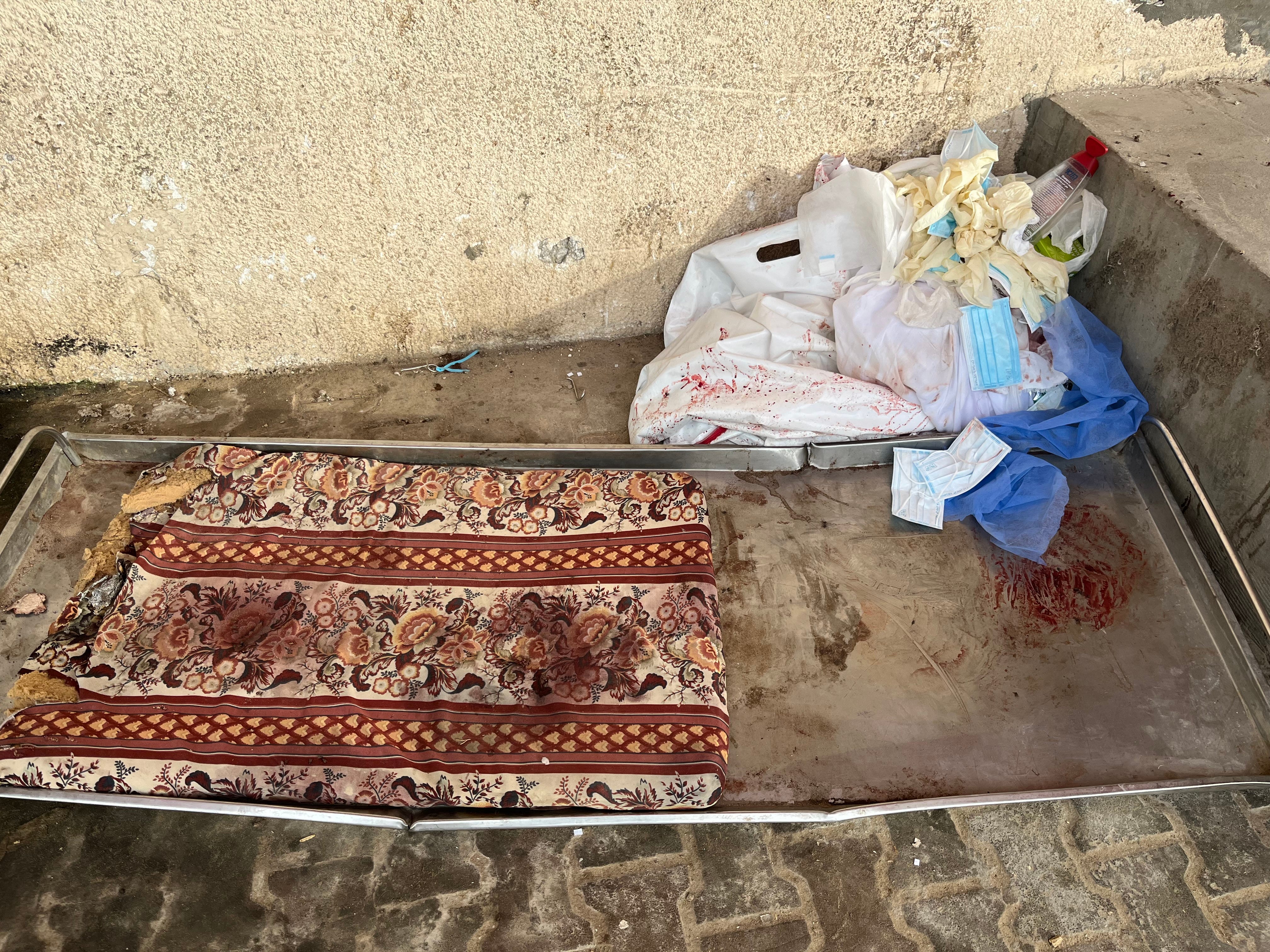 Like all other medical facilities still standing in Gaza, Al-Aqsa hospital is barely functioning. Bloodstained gowns and bandages litter the ground. Torn blankets lie atop twisted gurneys.