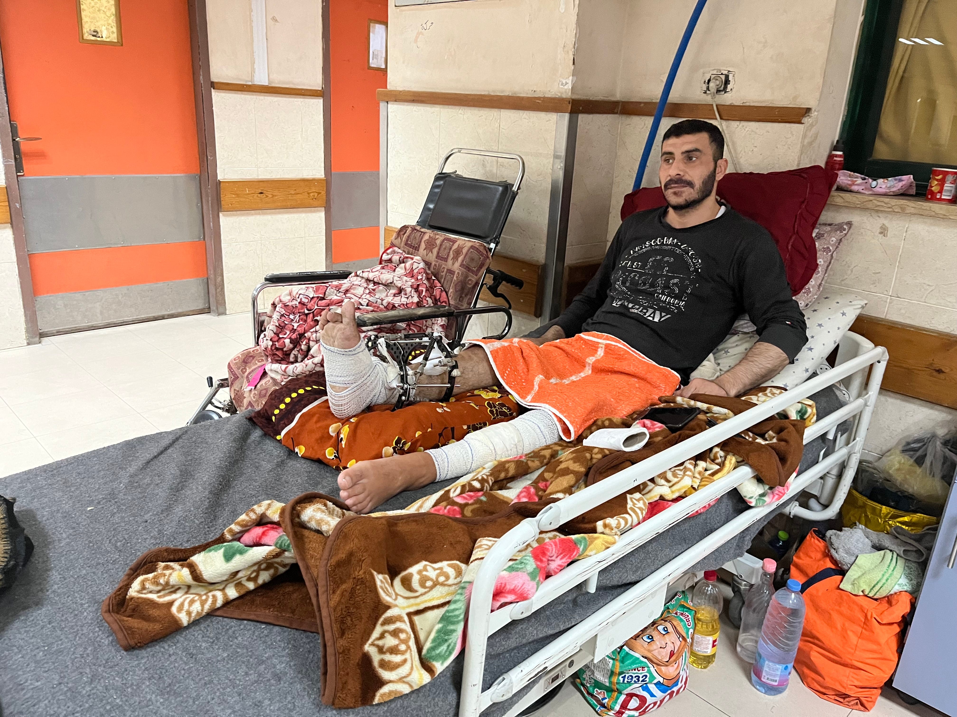 “There is a list of many medicines and antibiotics doctors prescribed to me that I should take but are not available,” Abu-Lebda said. “Consequently, I take bad substitutes like Rocephin and Paracetamol that do little to alleviate my suffering. I have to take bone-weakening Declophen to sleep. I also take other medicines to try and cope with the pain. Even the device that functions to pump the clotted blood out from between my crushed bones is not available here. I also need good nutrition, specifically meat and fish, but I only eat canned food of a horrible quality once or twice a day, which increases my complications over time,” he said, wincing in pain.