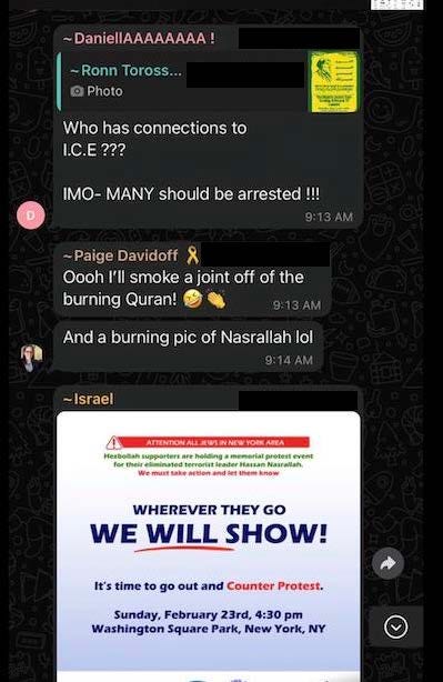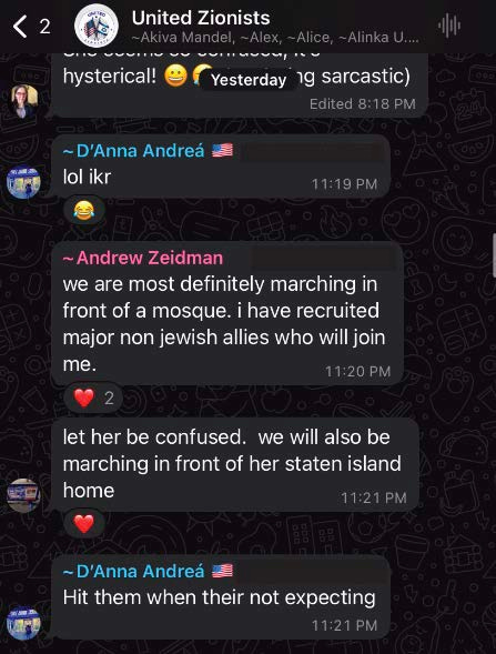 In addition to planning protests, the chats show members creating fake social media accounts to impersonate pro-Palestinian activists online, monitoring the locations of pro-Palestinian demonstrations, and researching the home addresses of activists.