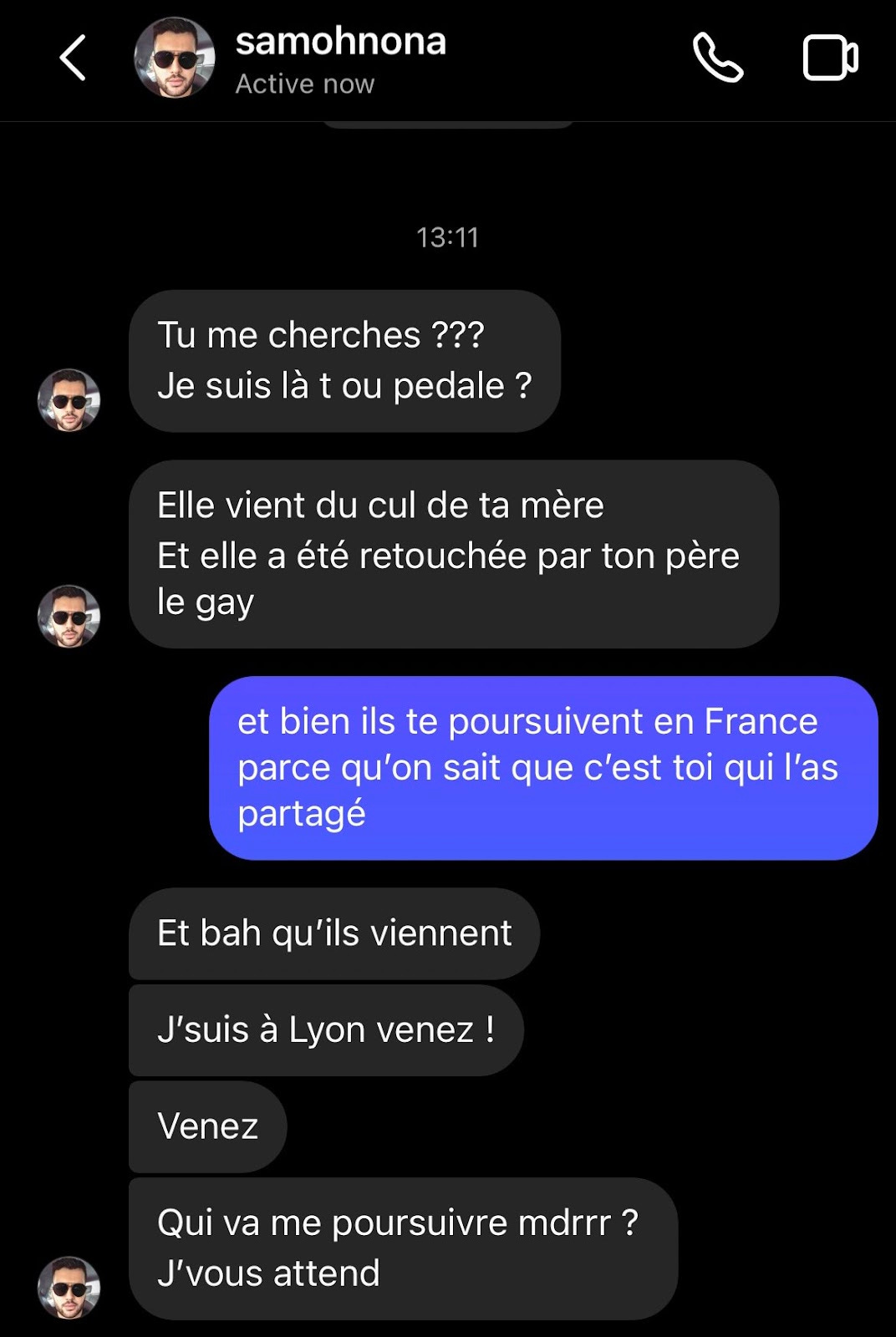 Samuel published the videos on a private Instagram group called “We are tearing apart Palestinians.” The picture for the group is an image of a dead Palestinian. When Tirawi noted the legal consequences such a video may pose in France, Samuel remained defiant, saying: “Let them do. I'm in Lyon (France), come! Who's going to sue me lol? I'm waiting for you.”