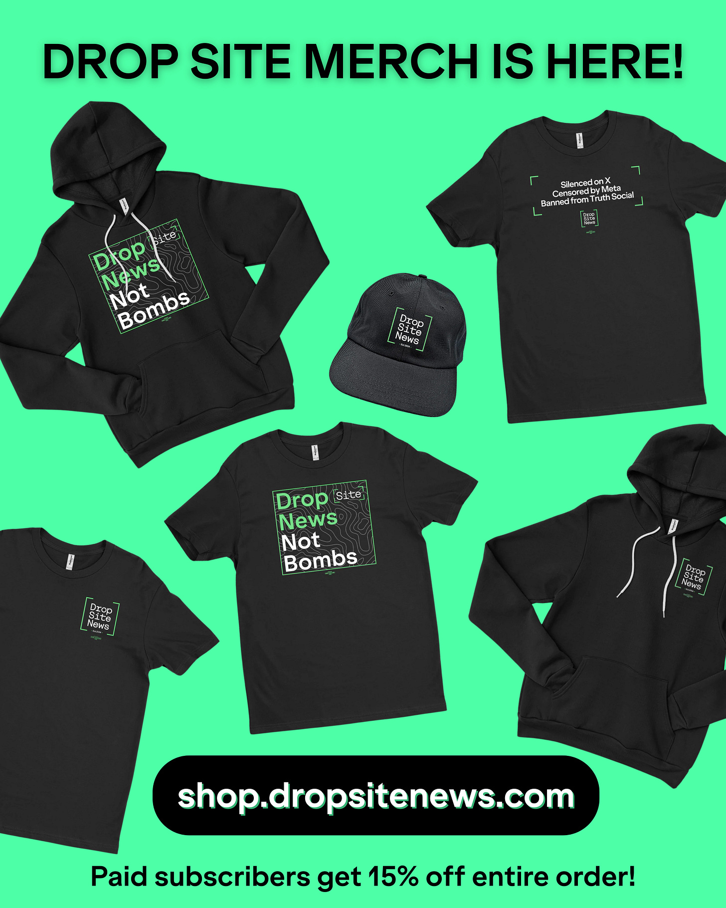 After many requests from our community, we're thrilled to announce that the official Drop Site News merchandise store is now live! You can finally wear your support for our journalism with our brand new collection at shop.dropsitenews.com.