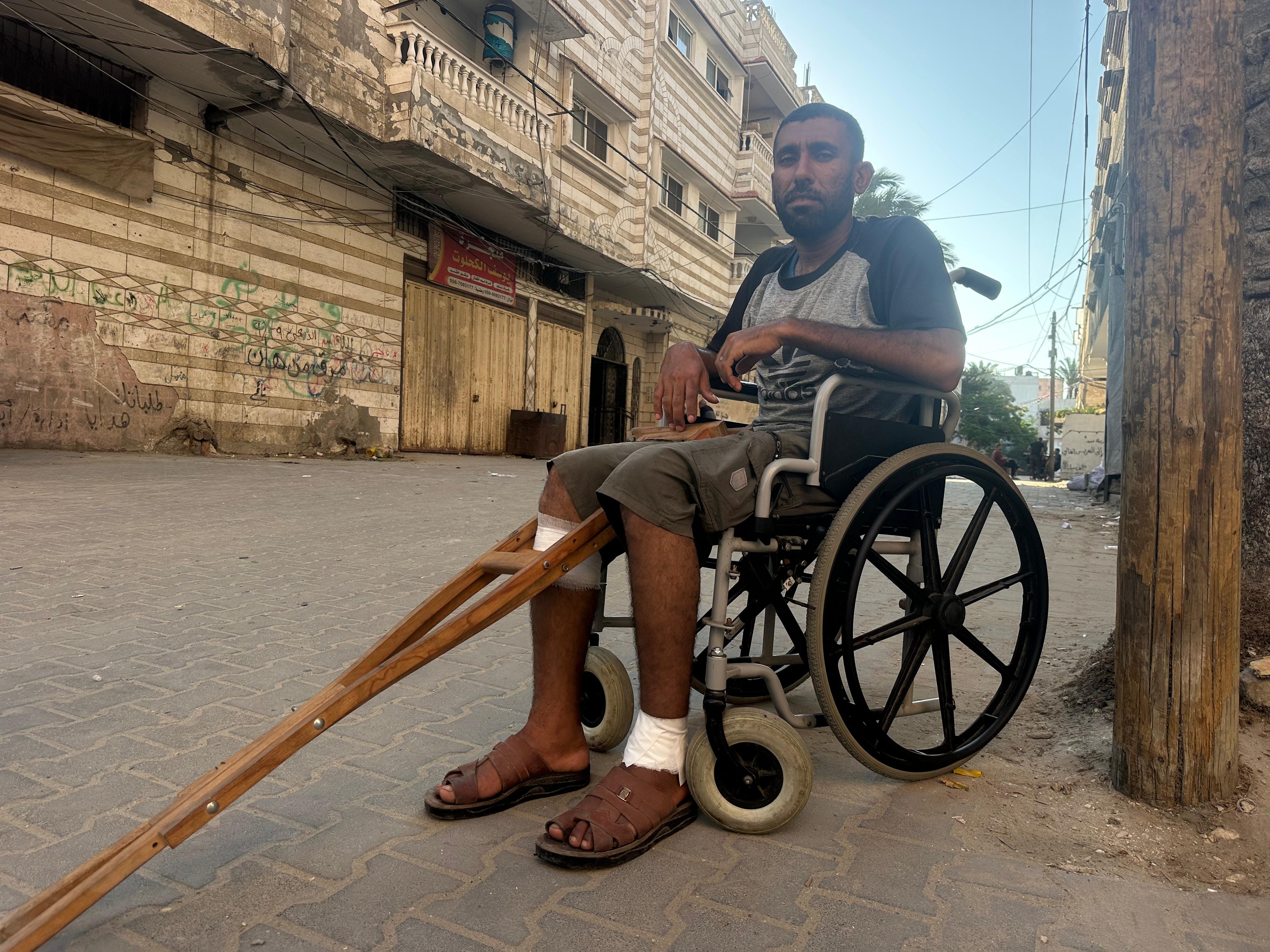 Ahmed Nejm, a 28-year-old currently displaced with his family of 10 in Deir al-Balah, is in a wheelchair, unable to walk after he was wounded in an Israeli attack on a gathering of Palestinians seeking aid near Wadi Gaza (the Netzarim Corridor) on June 11. He went to the site fully aware of the risks.