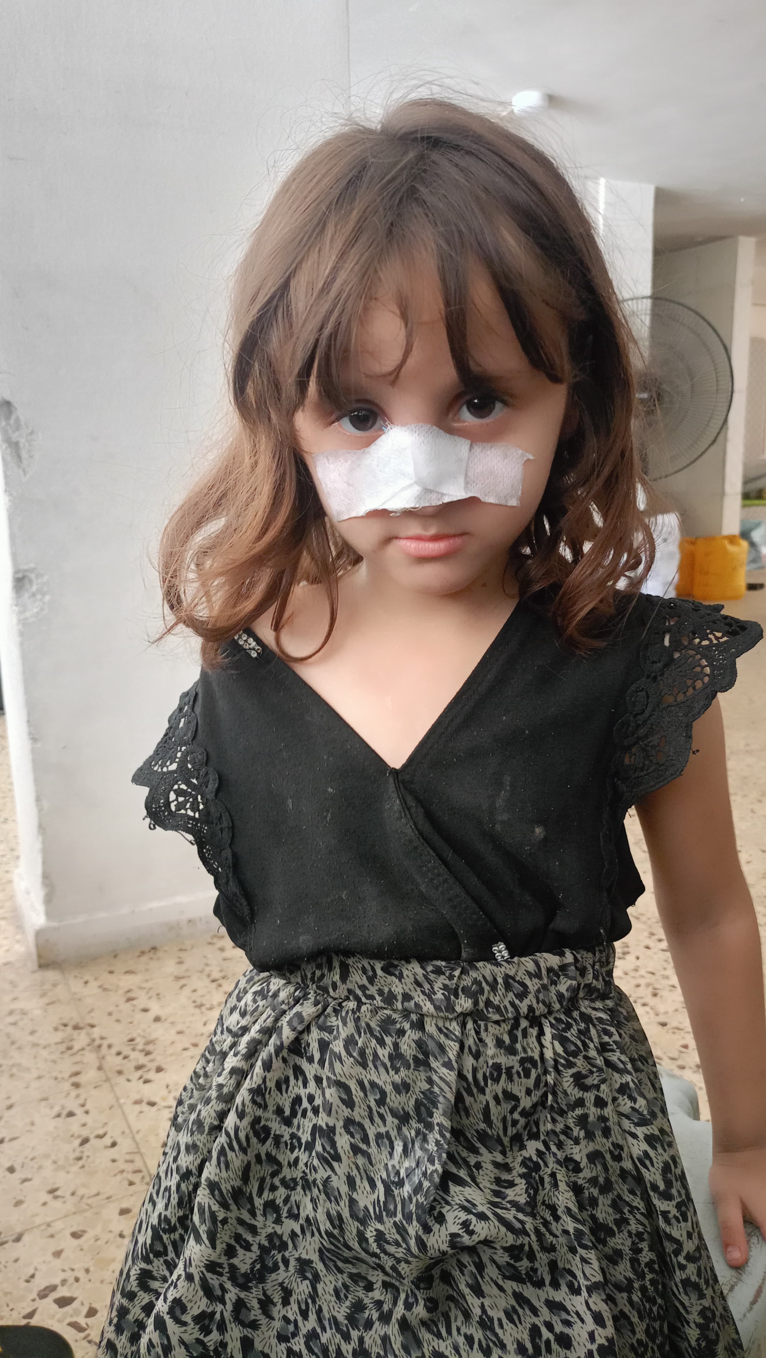 My six-year-old daughter, Hour, had been playing in front of our tent, but when I looked over, she had been hit by shrapnel and had blood pouring from her nose. I rushed to her in a state of terror and tried to figure out the extent of her injuries. She appeared stable, but there was blood gushing from a wound in her nose.