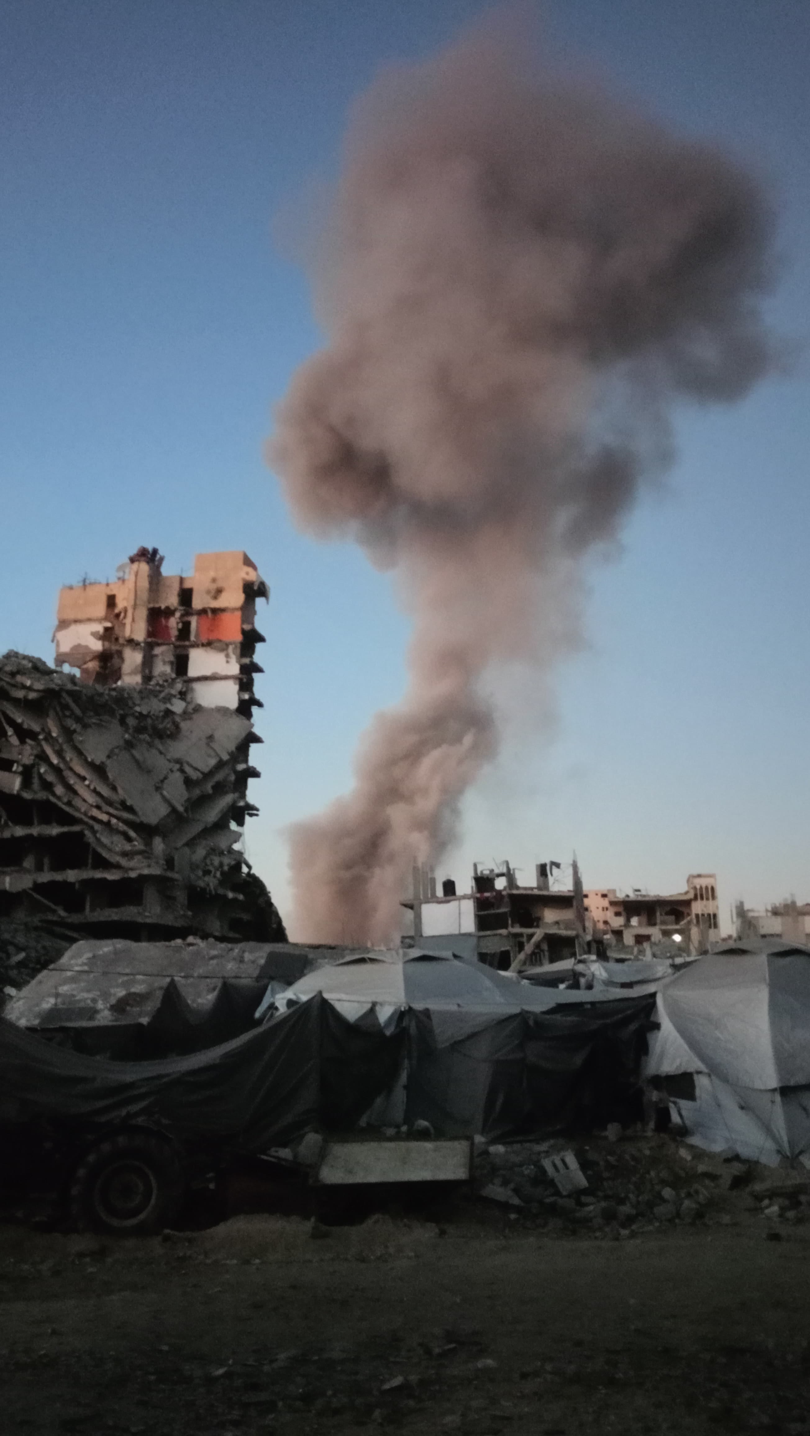 Later that evening, as I was preparing the bedding for my children, I heard a great commotion outside the tent. Families in the neighborhood were running and trying to hide from Israeli quadcopter drones, which were firing randomly at everything that moved.