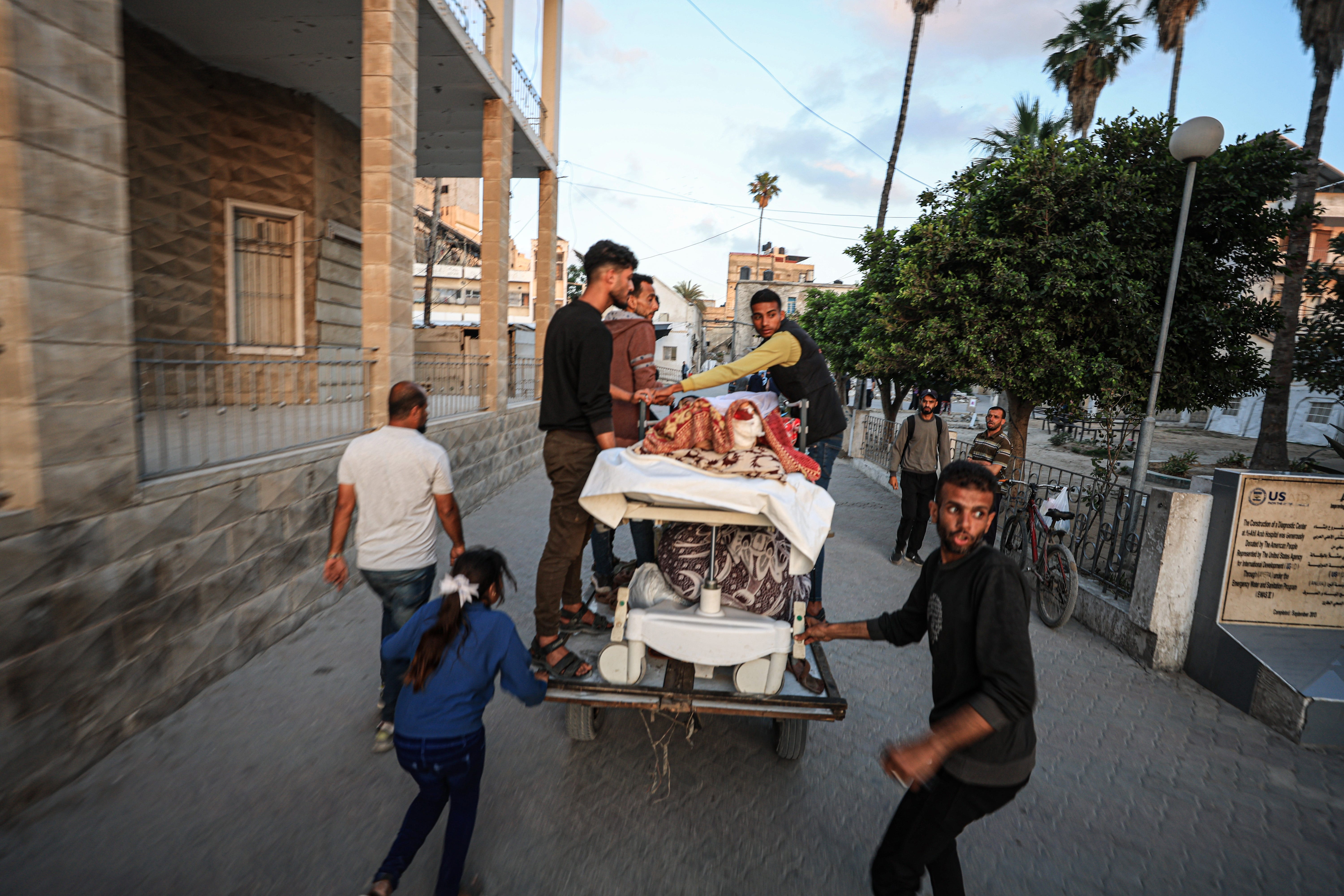 At al-Shifa hospital complex, crowds gathered at the main gates to help evacuate their wounded relatives, despite an announcement by the hospital director Mohammad Abu Salmiya that he had not received a direct displacement order from the Israeli army. People streamed out carrying their injured family members on stretchers alongside portable oxygen cylinders.