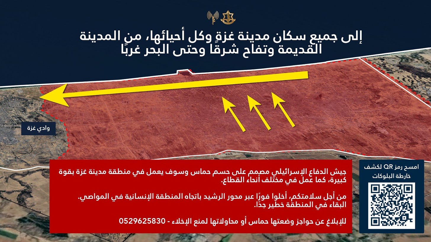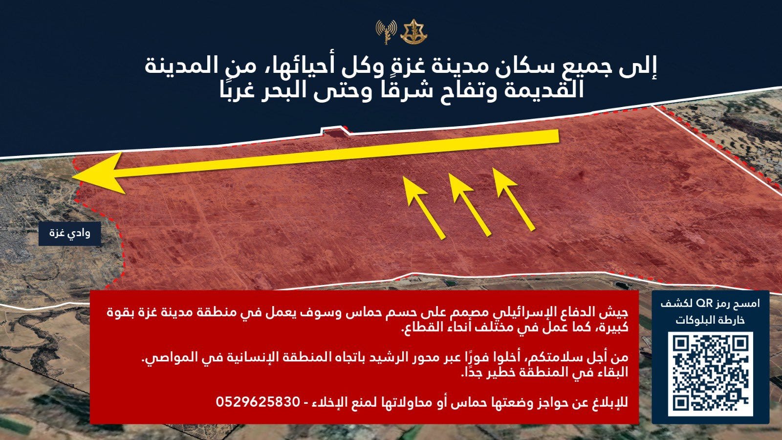 Monday’s displacement order was accompanied by a map of all of northern Gaza depicting three arrows pointing to the west and a large arrow pointing south—a graphic depiction of Israel’s ethnic cleansing campaign. But, with the coastline and adjacent streets converted to a mass of tents and makeshift shelters, families cannot find space to displace to the south, even if they wanted to.
