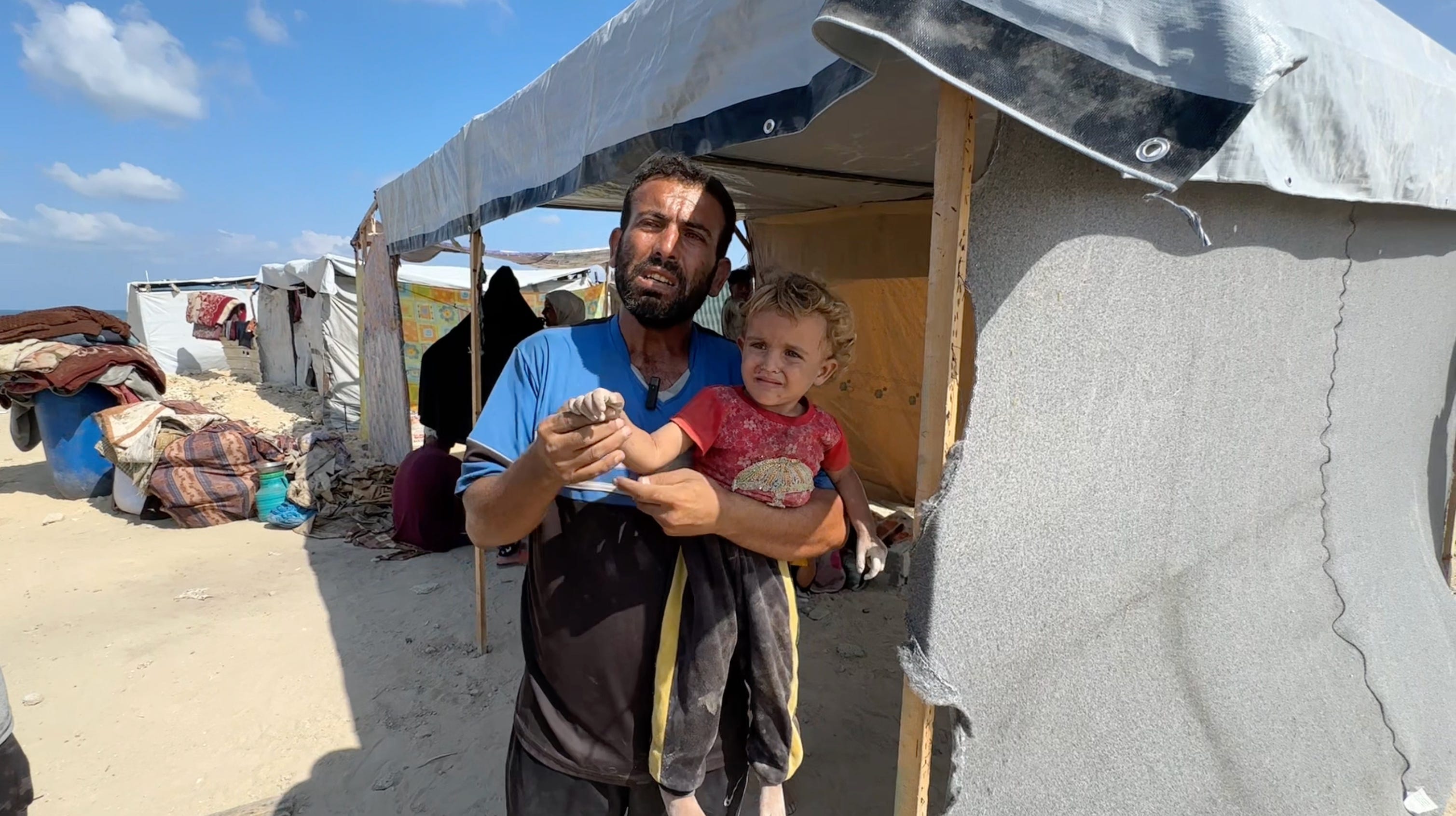 “As you can see, we’re putting up tarps, gathering blankets, tearing them apart and using them. We get curtains and wood from the streets to support ourselves,” he said, as his children stood nearby covered in dust. “We’re living on the beach. They know we’re here, on the beach. What is this child’s fault—we’re deprived of things she’s never even seen.”