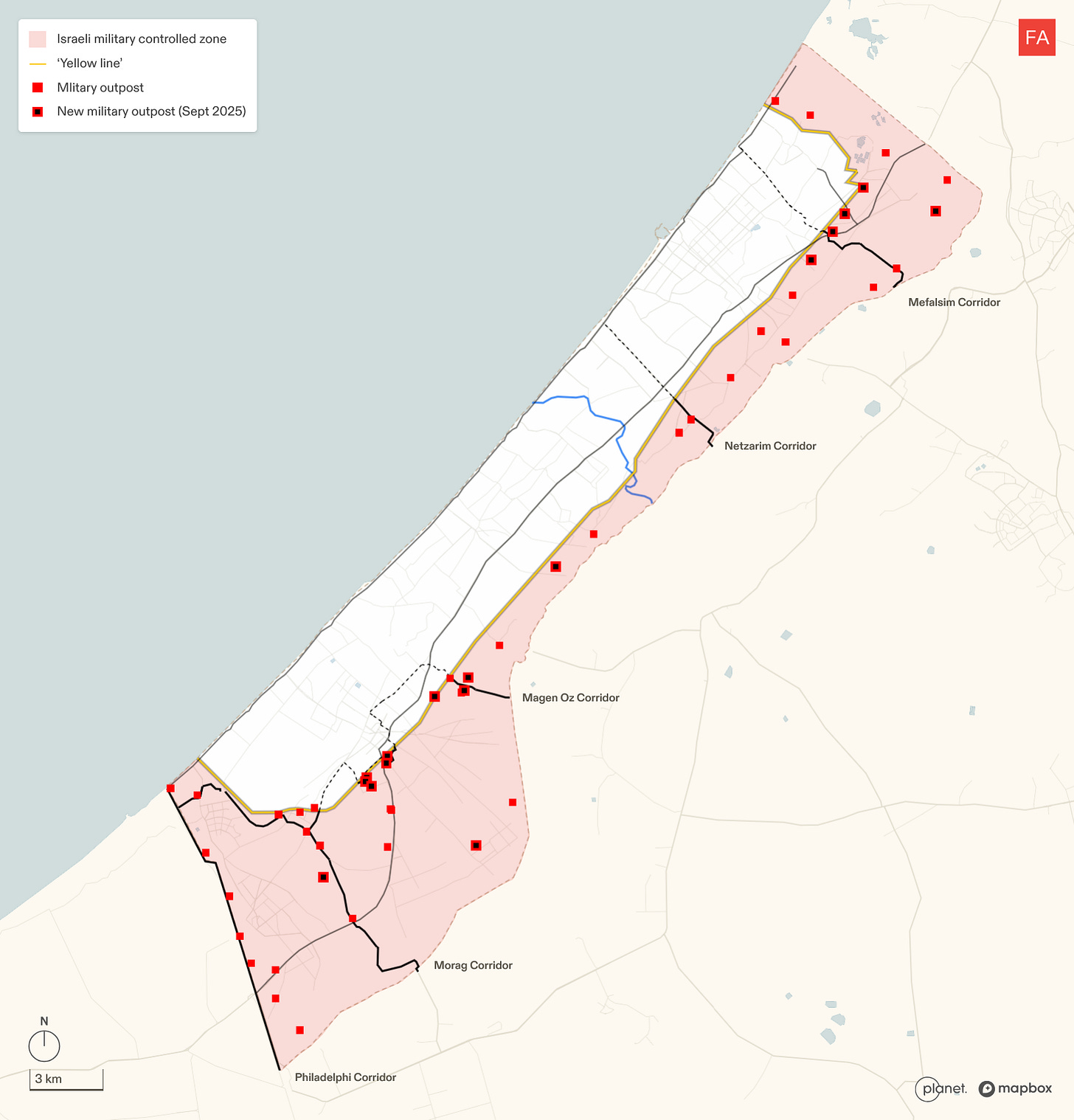Israel has constructed at least 13 new military outposts inside Gaza since the ceasefire—primarily located along the yellow line, in eastern Khan Younis, and near the border with Israel, according to analysis of satellite imagery by Forensic Architecture.