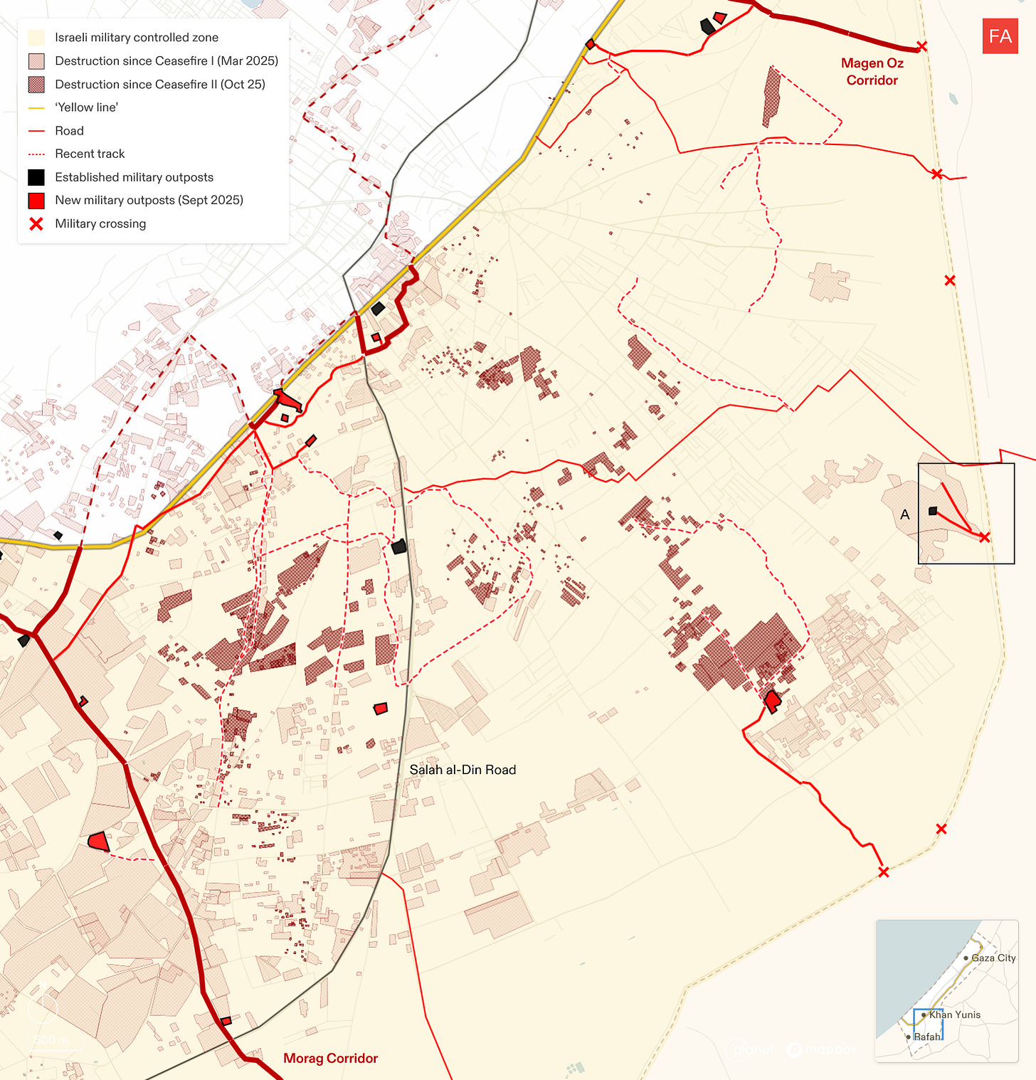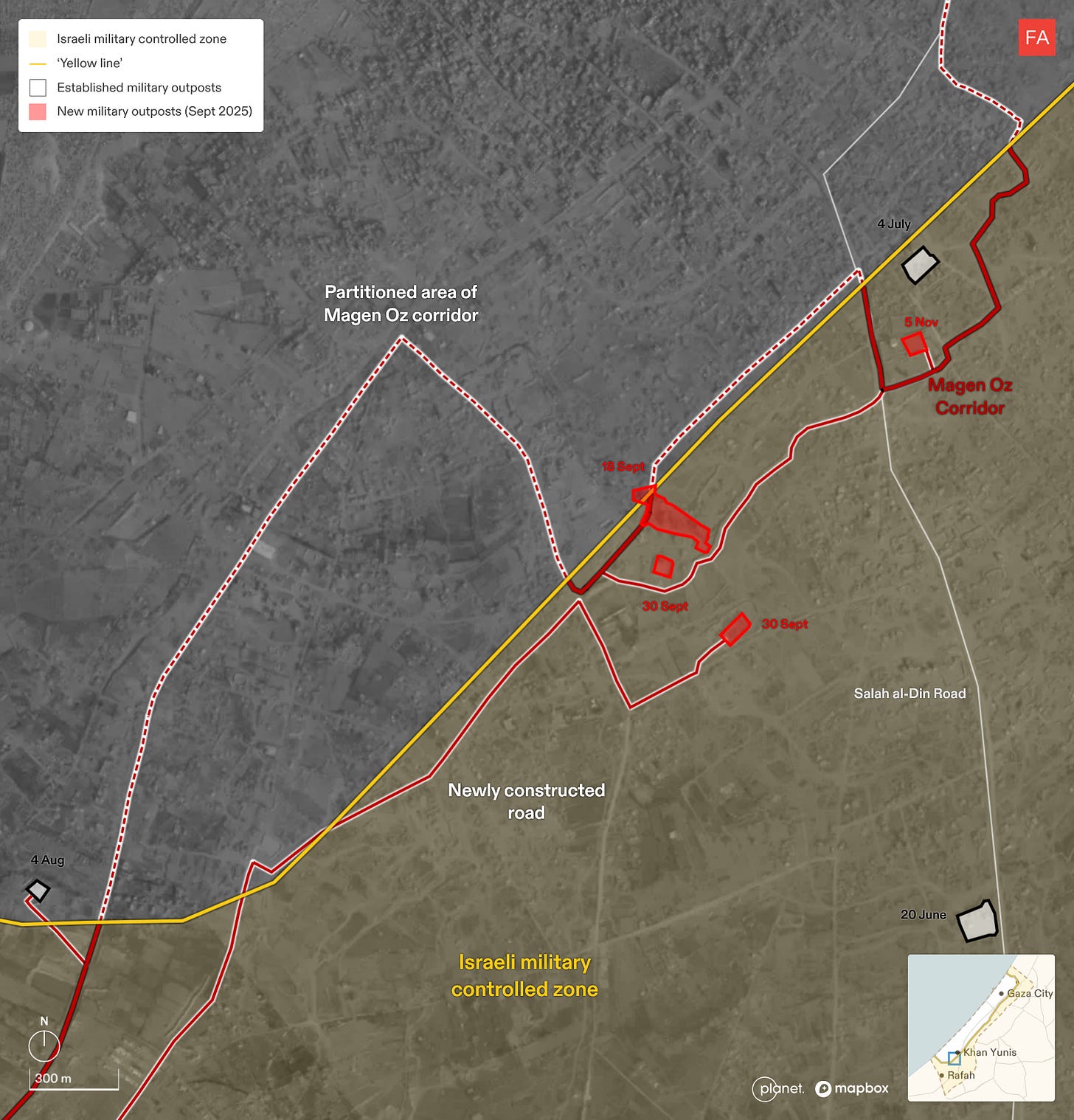 In mid-July 2025, the Israeli military announced the completion of the Magen Oz corridor, a 15-kilometer military road separating the city of Khan Younis into its eastern and western parts. Since September, Israel has been constructing a new road in Khan Younis, re-routing the Magen Oz corridor to run within its area of control.