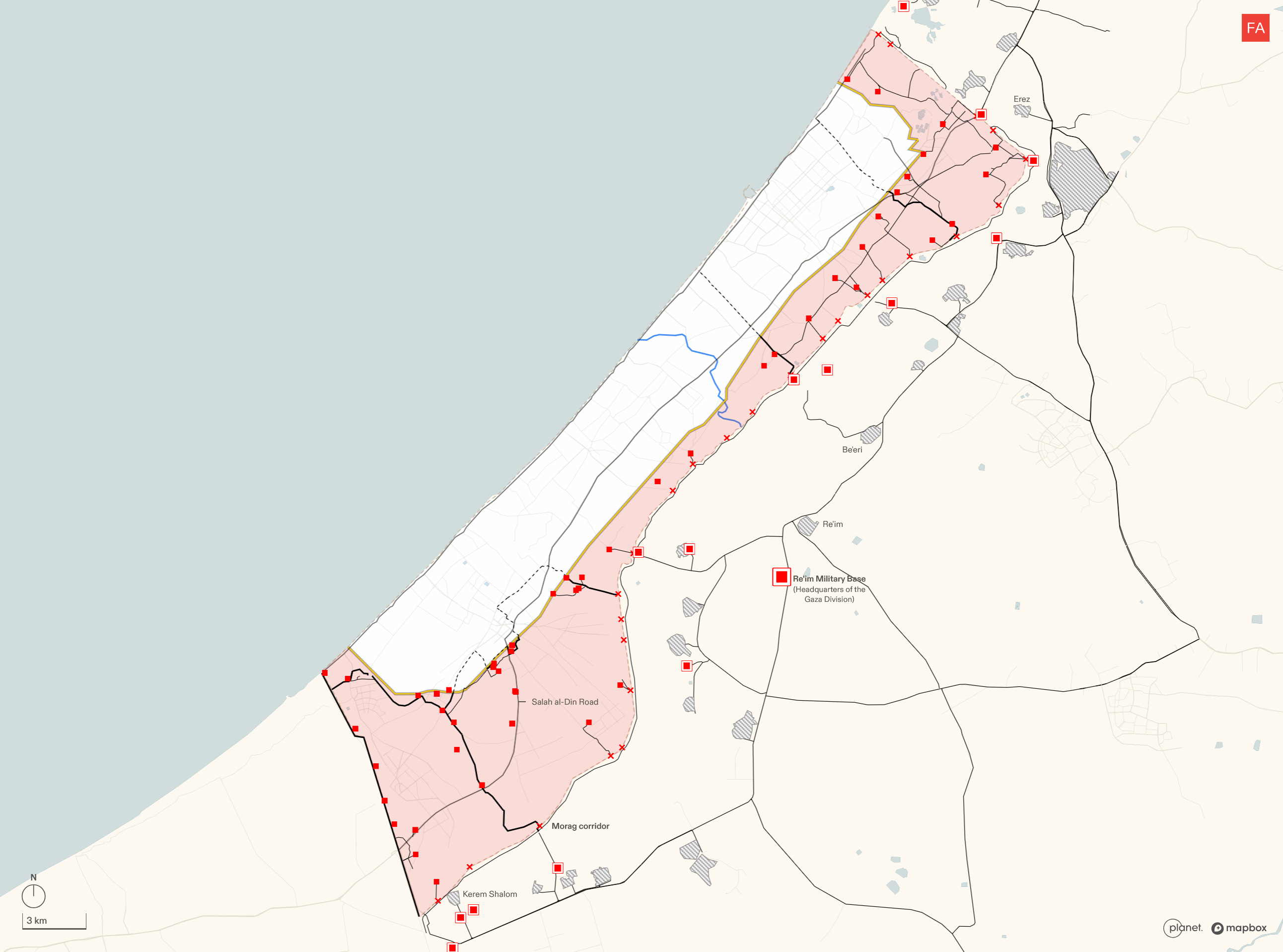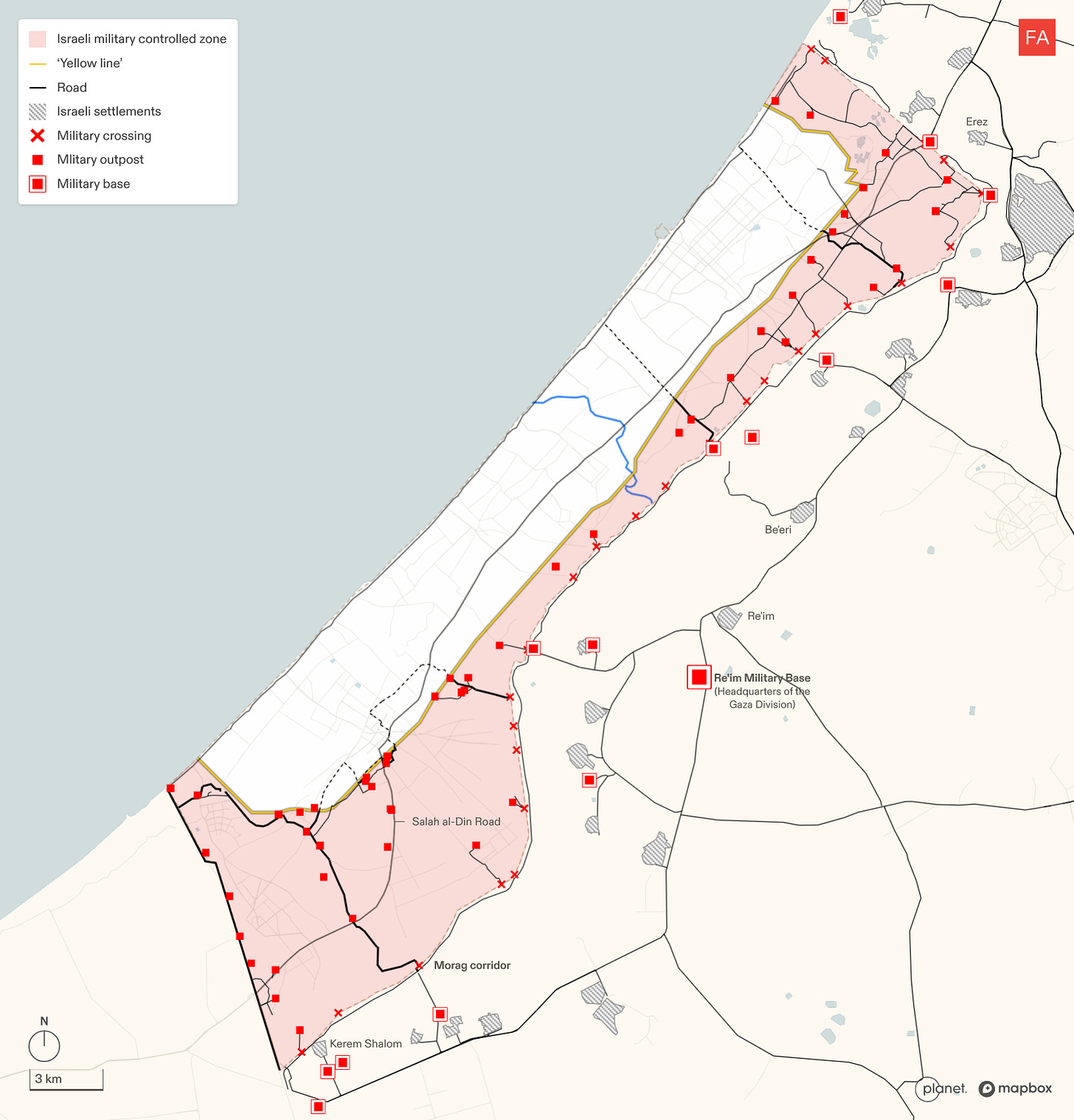 Within Gaza, Israel is currently maintaining 48 military outposts east of the yellow line. The outposts are connected to a network of roads which have been created, expanded or appropriated by the Israeli military. In turn, these link to Israeli bases, roads, and settlements outside of Gaza.