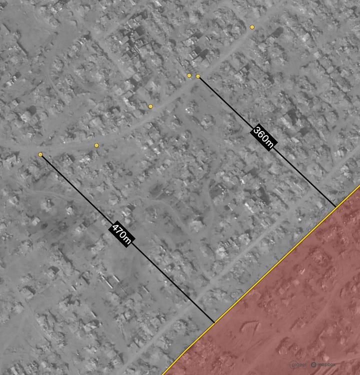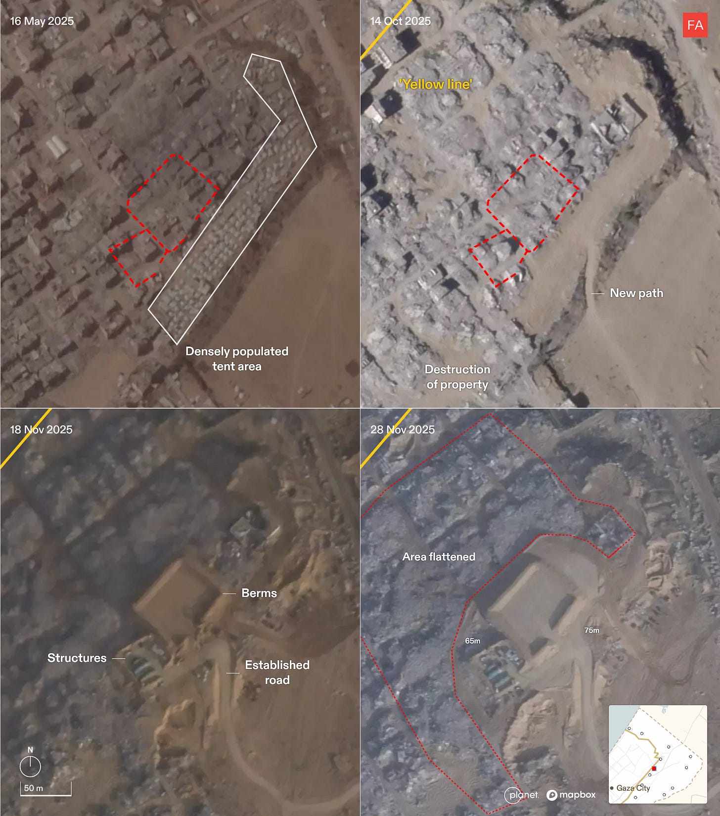 While the “standards, milestones, and timeframes” around Israel’s withdrawal have been highly contentious, they are nevertheless the principal subject of ongoing negotiations. However, the analysis by Forensic Architecture clearly shows that Israel is consolidating its military presence on the ground east of the yellow line in a way that suggests no intention of a further withdrawal.