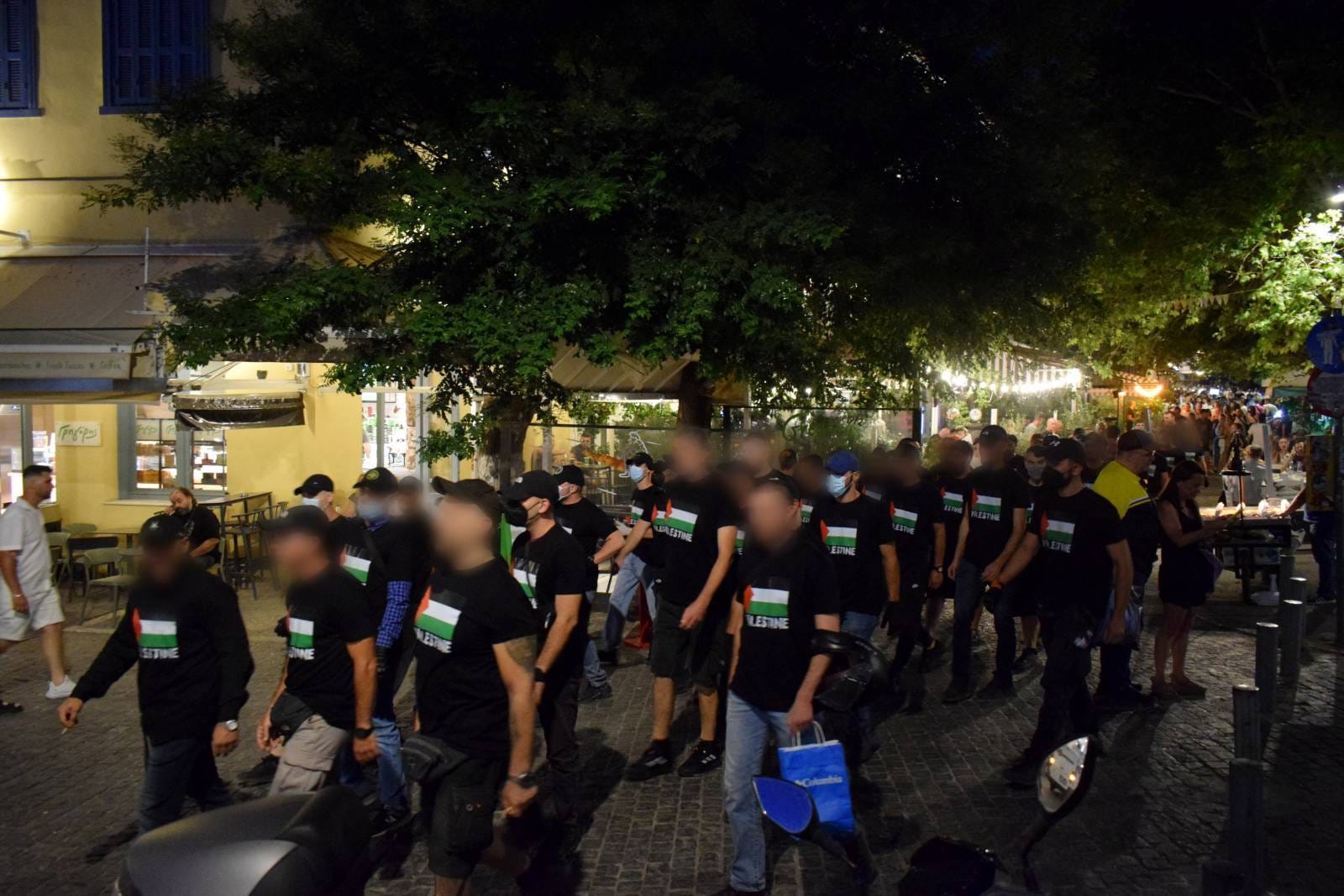 On July 11, Rouvikonas, along with Marxist/Leninist group T-34, organized the first of what they called “Palestinian Strolls”—with a group of some 50 people wearing matching black T-shirts featuring the Palestinian flag taking a long walk along some of the most touristic sites around the center of Athens. The organizers declared that they wanted to assert their right to walk around their own city of residence without being attacked or harassed. “Our protocol was simple. We just walk, we don’t bother anyone. If anyone, of any nationality, is bothered by us and they express it, we respond proportionately,” Dapergolas said.