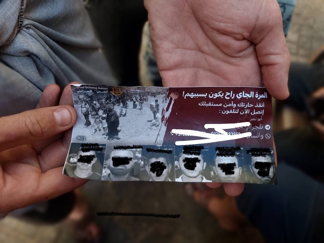 In November, similar pamphlets with pictures of several alleged Hamas members rained down over Deir al-Balah and Khan Younis, threatening residents that if the men remained at large, their neighborhoods and future would be destroyed.