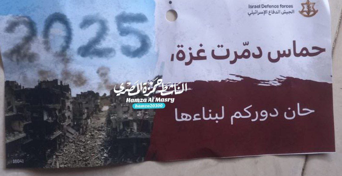One day earlier, Israeli jets flying over Khan Younis dropped leaflets with the message: “Hamas has destroyed Gaza. It’s your turn to rebuild it” alongside a picture of smoke rising over a devastated urban landscape forming the year “2025.”