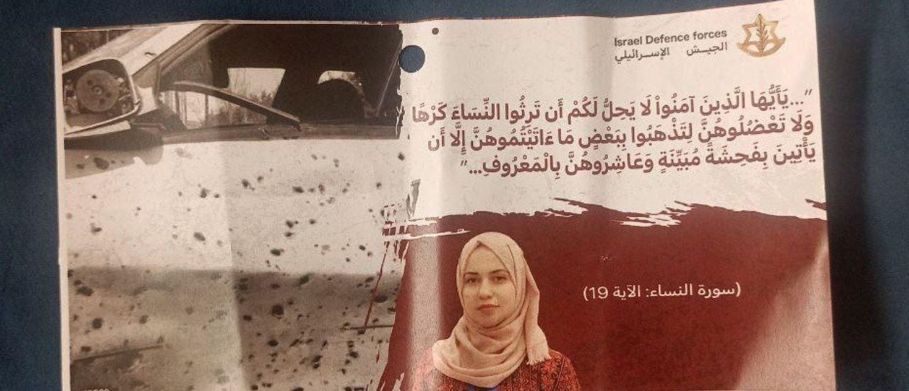 On January 7, Israel dropped leaflets over Khan Younis depicting Hamas’ accidental killing last September of Islam Hijazi, an employee of HEAL, a Palestinian medical NGO. The leaflet included a verse from Surat Al-Nesaa in the Qur’an that encourages the fair treatment of women.