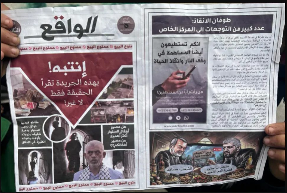 Israel has also produced tabloid-style newspapers that it has dropped across Gaza. One was titled “Reality” with the main headline: “Take notice: This newspaper is where you read only the truth.” Sinwar’s face is plastered next to photos of bundles of cash with the slogan: "Is Sinwar's children's future more significant than yours?" It included sections that look like advertisements saying: "You can help bring about a ceasefire and preserving life. Have you seen any of the hostages?” atop phone numbers to call to provide information.