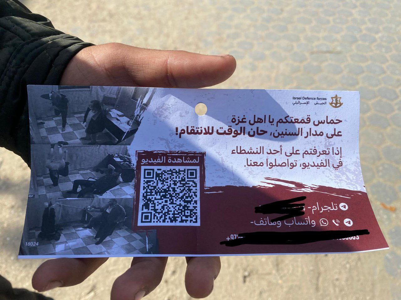 Similar leaflets were dropped over Jabaliya and Beit Lahia a few weeks earlier. These included stills from a security camera video showing a man being tortured along with a QR code for the video. The caption reads: “Hamas has repressed you for years, people of Gaza, it’s time for revenge.” It calls on residents to come forward with any information about the perpetrators in the video, providing contact information for the Israeli military on Telegram and WhatsApp.