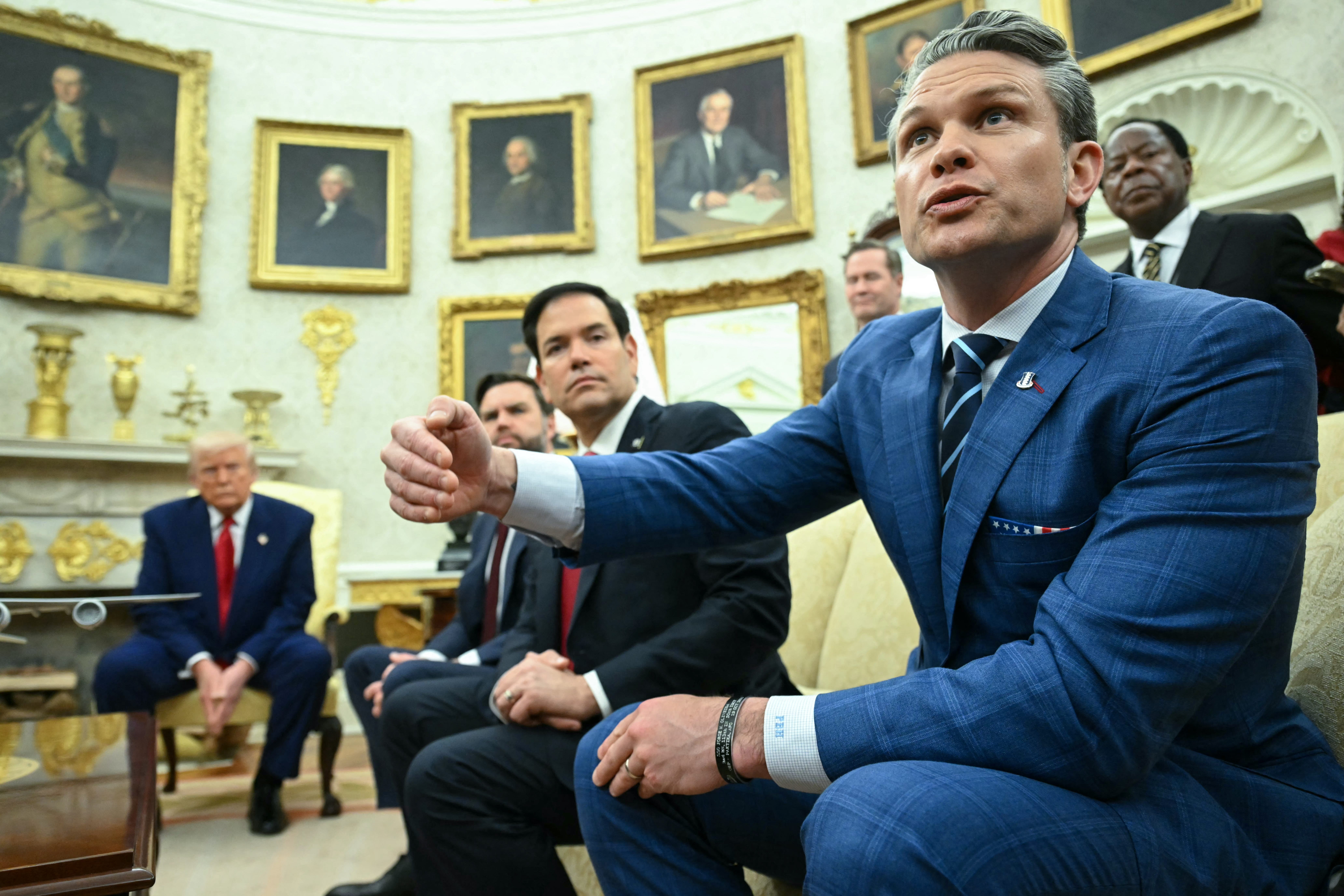 Trump then turned to his defense secretary Hegseth, sitting at the far end of the couch, and asked him to weigh in.