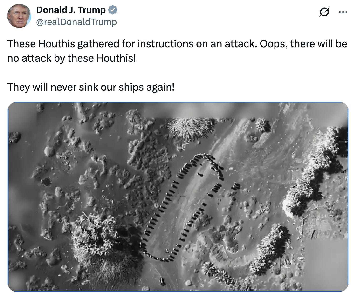 On April 4, Trump posted a video on social media, one that would have been a scandalous revelation brought to light by Wikileaks not long ago. The video depicted a U.S. missile raining down on a tribal gathering in the hinterlands of Yemen. “These Houthis gathered for instructions on an attack. Oops, there will be no attack by these Houthis! They will never sink our ships again!” declared Trump. The attack reportedly killed more than seventy people. U.S. Central Command, which oversees the strikes against Yemen, did not publish the video, nor has it offered any details about the strike.