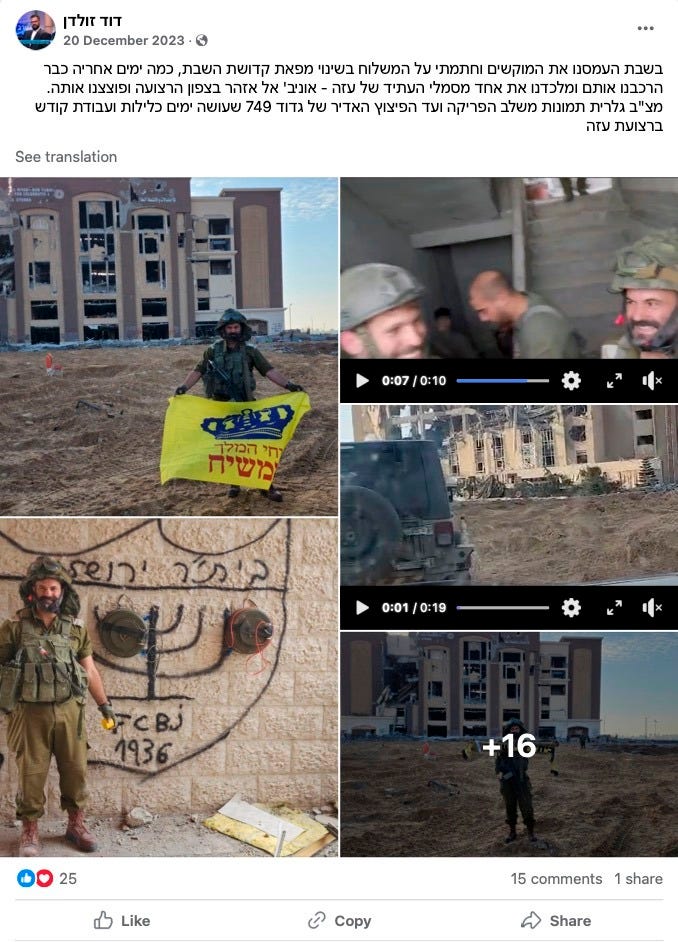 In December 2023, Company A of the 749 Battalion was tasked with rigging up the south Gaza City campus of Al-Azhar University with explosives and detonating them, reducing Gaza’s second-largest university to rubble. "On Shabbat, we loaded the mines, and I signed off on the shipment with a modification due to the sanctity of Shabbat,” First Master Sergeant David Zoldan, the operational officer of Company A of Israel’s 749 Battalion wrote in a Facebook post on December 20. “A few days later, we assembled them and booby-trapped one of Gaza’s symbols of the future—Al-Azhar University in the northern part of the strip—and blew it up.”
