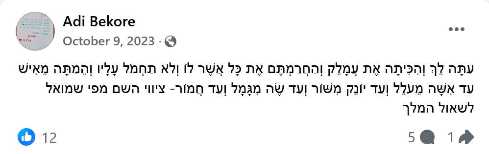 This is what the deputy commander of Israel’s 749 Combat Engineering Battalion, Lieutenant Colonel Adi Bekore, posted on his personal Facebook account on October 9, 2023, just two days after the Hamas attacks of October 7. Numerous soldiers from the battalion he had command over liked the post. It is a quote from a biblical passage in which the biblical nation of Israel is commanded to attack the Amalekites, an ancient biblical nation that was a recurrent enemy of the Israelites. Israeli Prime Minister Benjamin Netanyahu also invoked this reference early in the war—a moment cited by South Africa in its case to the ICJ as a piece of genocidal rhetoric: