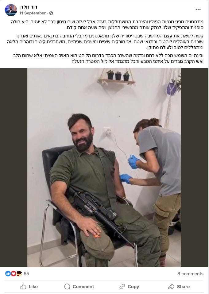 Ahead of yet another round of assaults on Gaza, David Zoldan, the operational officer who had signed off on the mine shipment intended to destroy Al-Azhar University, mocked the devastating epidemics sweeping through the besieged Palestinian population—epidemics caused by the Israeli military's deliberate destruction of Gaza's medical infrastructure. On September 11, Zoldan was vaccinated just before entering Gaza. On Facebook, he posted: "Vaccinating against the polio and jaundice epidemics raging in Gaza, but no vaccination will help Gaza anymore. She is terminally ill, and it is our job to disconnect her from the oxygen devices, and the sooner, the better."
