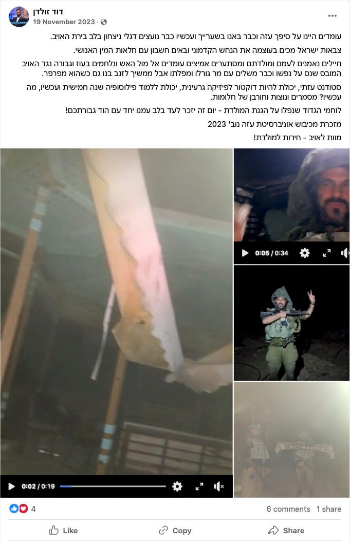 Zoldan—a reservist who normally works as a journalist at ICE, a local Israeli news outlet—attached several photos and videos of the entire operation “from the unloading stage to the massive explosion.” In one of the videos, he cheers as the three buildings of the university campus are prepared to be blown up. “This is the explosion before redemption. December 2023.”
