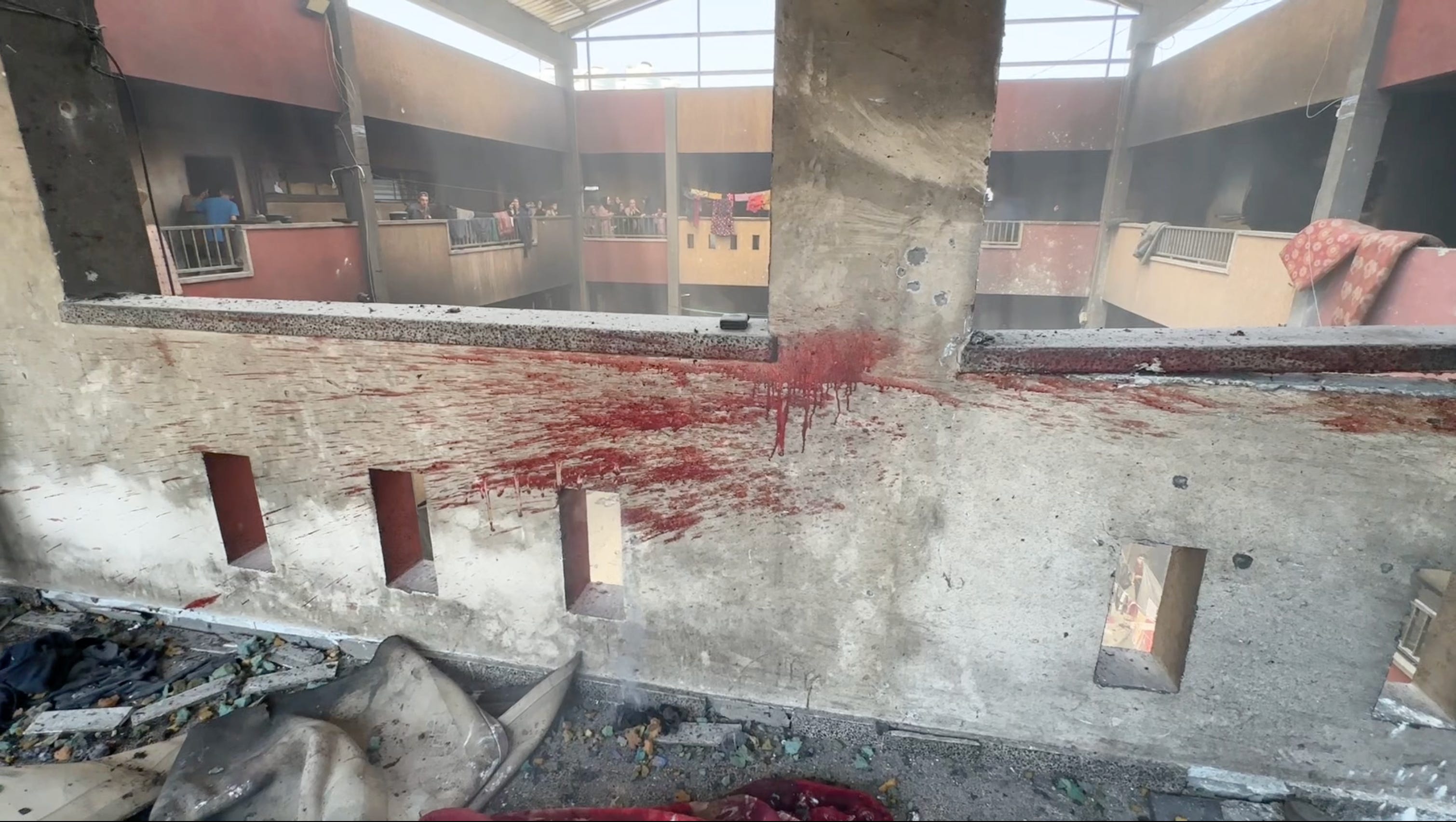 Dead bodies lay in the hallways, some ripped apart and limbs torn off. People fled the building in panic carrying children and few belongings. Blood covered the walls and floors. People lifted the dead and wounded, some badly burnt, to ambulances outside using blankets. At least one baby was among the dead, with the left side of its body blown off and flesh torn apart, being carried outside by emergency medical worker Omar Abu Mohsen.