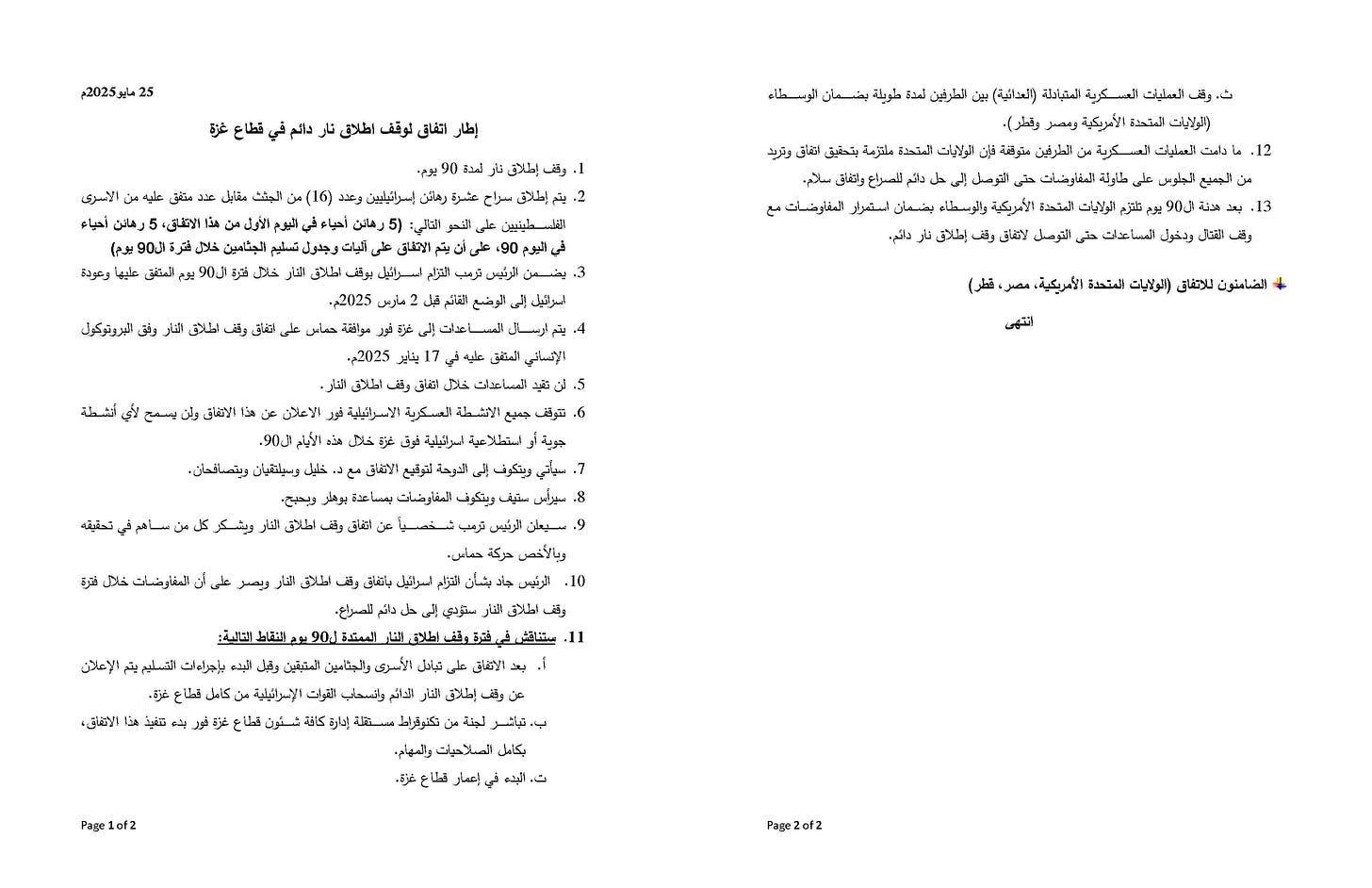 Ten Israeli hostages and (16) bodies will be released in exchange for an agreed-upon number of Palestinian prisoners, as follows: (5 live hostages on the first day of this agreement, 5 live hostages on the day 90, with the mechanisms and schedule for the handing over of the bodies to be agreed upon during the 90-day period.)