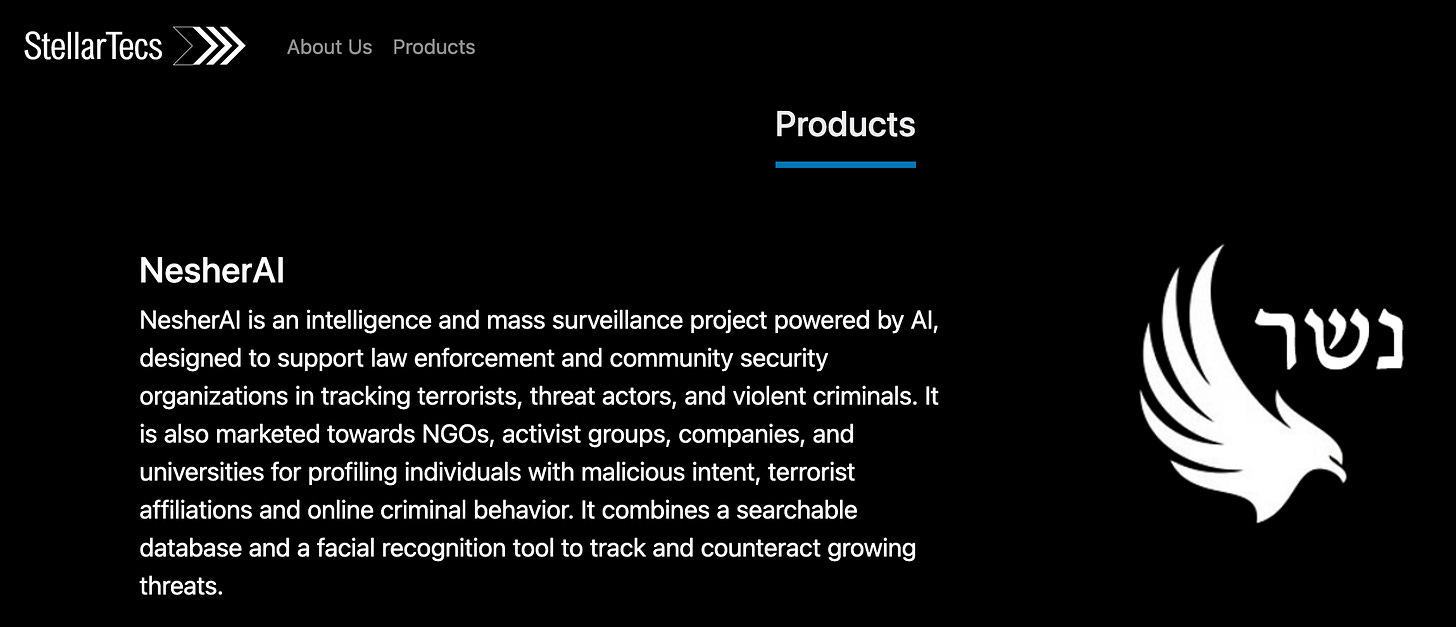 Stellar is the maker of NesherAI, a bespoke facial-recognition tool which it claims is capable of deanonymizing pro-Palestinian protestors. The name “Nesher” is Hebrew for “eagle,” the symbol for both NesherAI and the Terror Watch Agency, the brand under which it operates. Their slogan on social media is, “The Eagle listens, The Eagle watches, The Eagle knows.”