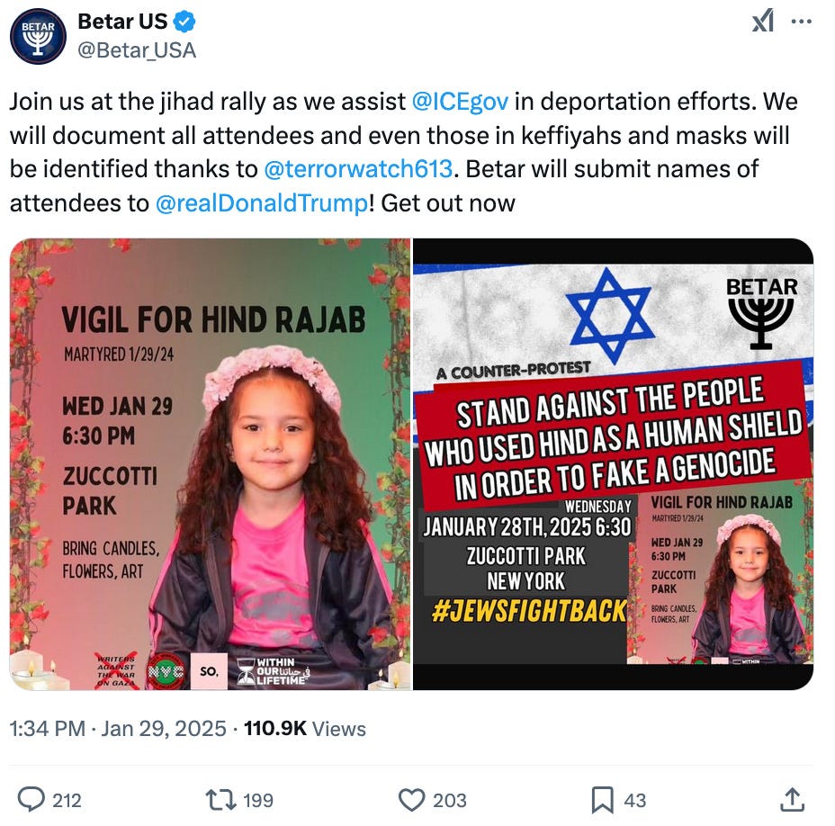 Betar’s social media post boasted that it would “document all attendees,” further promising that “even those in keffiyahs and masks” would be identified via the Terror Watch Agency and that Betar would submit the names of the attendees to President Trump. “Get out now,” the post continued, alongside a claim that Rajab’s story had been used to “to fake a genocide.” Notably, the Israeli government has similarly referred to a legal nonprofit named after Rajab as a “threat.”