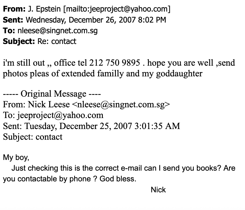 The relationship between Epstein and the Leeses remained intimate over the years. According to the emails obtained by Drop Site, Epstein was the godfather of Leese’s granddaughter, and both brothers affectionately addressed Epstein in their emails as “my boy.” In 2007, at Epstein’s request, Julian Leese sent a collection of family photos, writing, “Always thinking of you and the old days.”