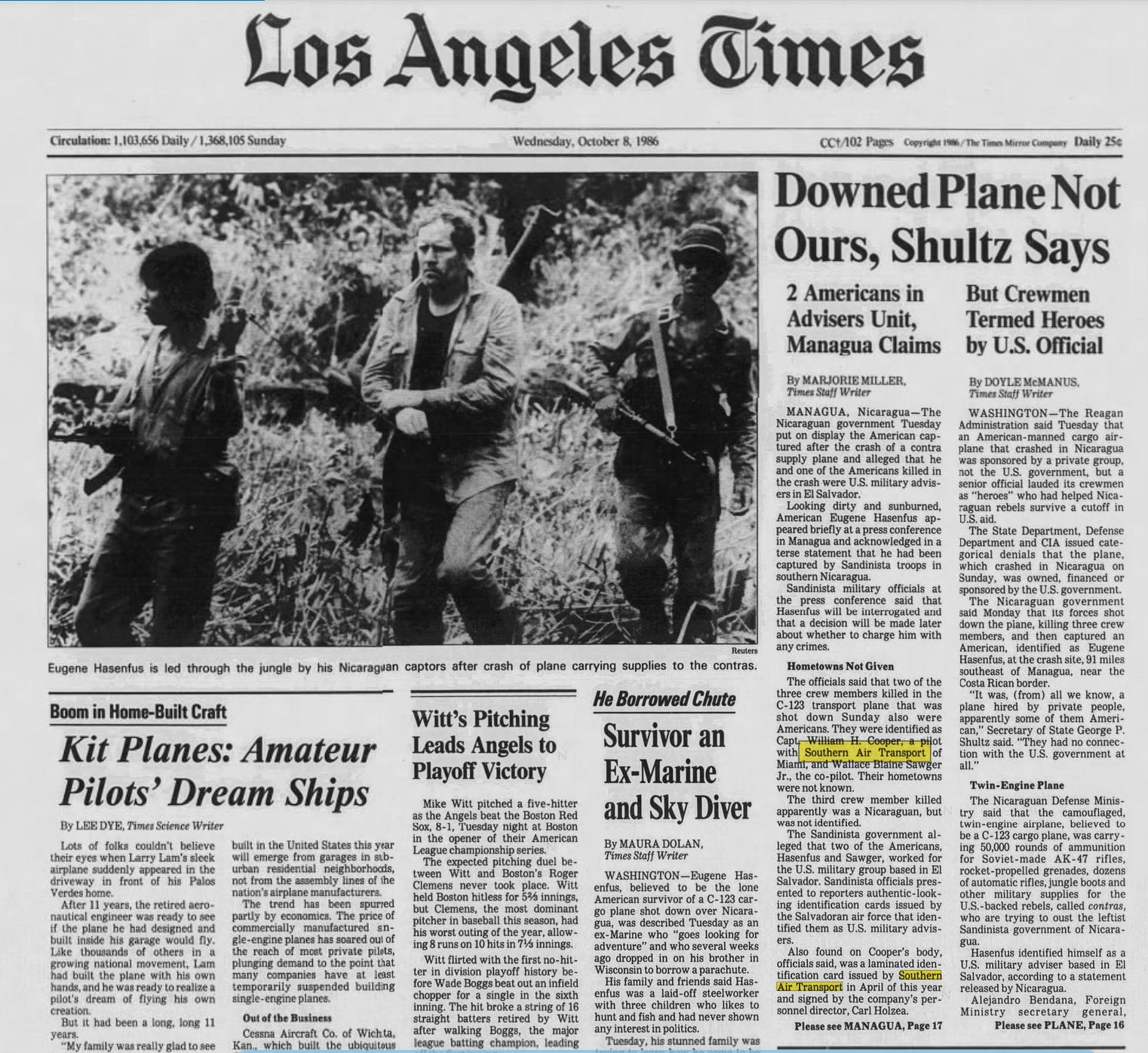 The downing of the plane, and the testimony of its lone survivor, Eugene Hasenfus, pulled a string that eventually unraveled the scandal known as Iran-Contra. Using Southern Air Transport planes, the CIA was shipping weapons to Iran, using Israel as a middleman, and deploying the profits to arm the Contras against the leftist Nicaraguan government.
