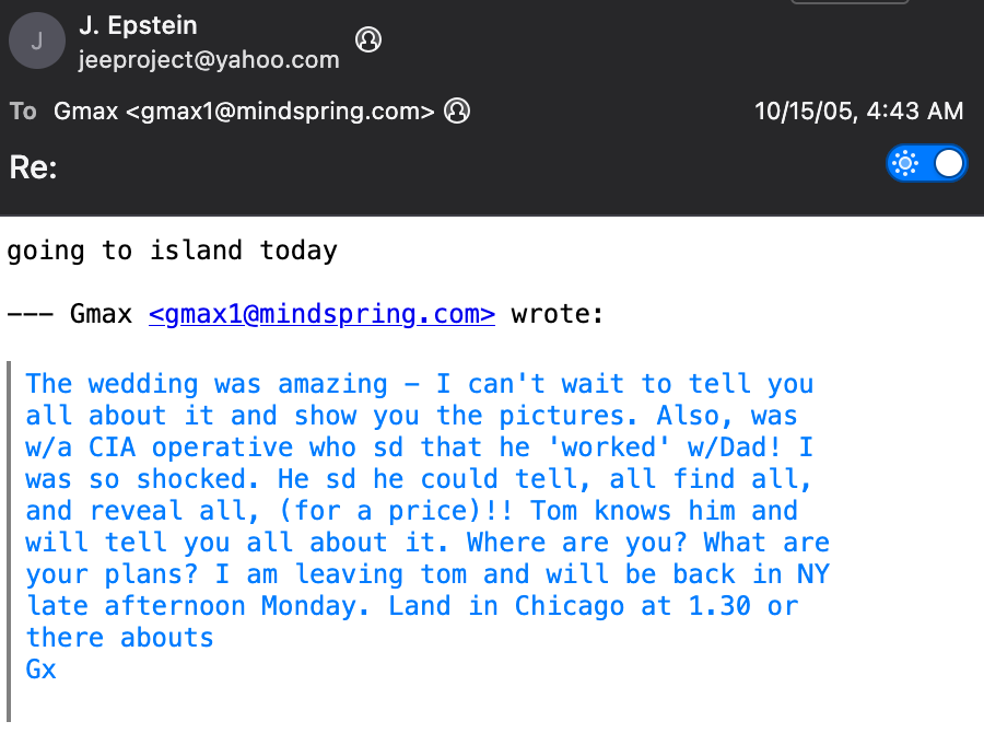 An email obtained from Epstein’s Yahoo! inbox, dated October 15, 2005, suggests Ghislaine Maxwell was trying to purchase information about her father’s missing fortune—from a CIA operative. Maxwell emailed Epstein excitedly while visiting Bhutan for the wedding of Princess Chimi Yangzom Wangchuck. She wrote Epstein, “The wedding was amazing…Also was w/a CIA operative who sd that he ‘worked’ w/Dad! I was so shocked. He sd he could tell, all find all, and reveal all, (for a price)!!”
