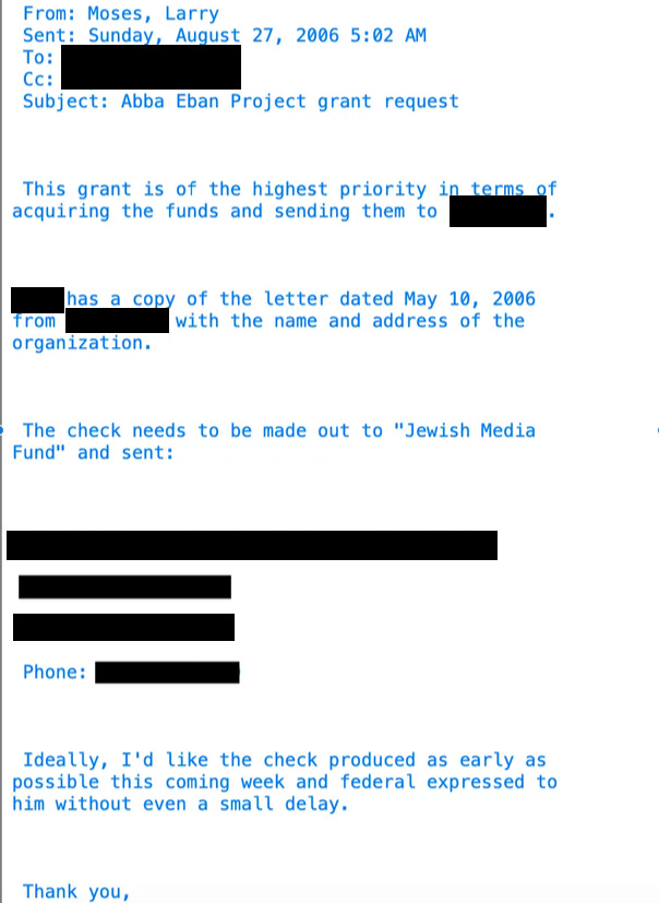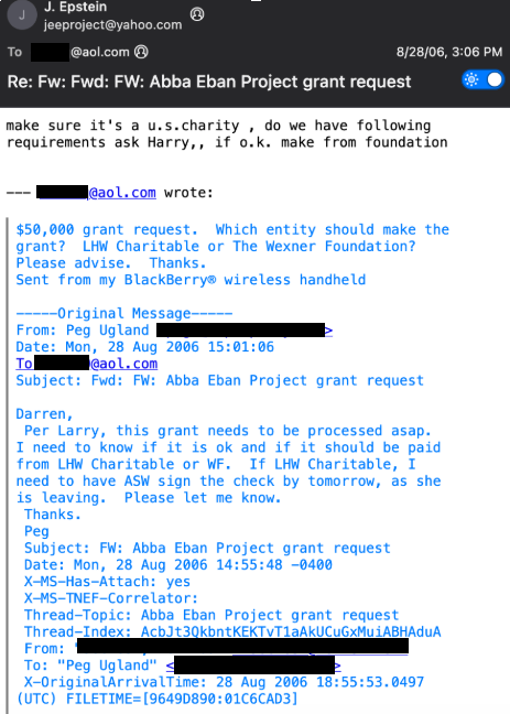 The Abba Eban grant, named for a famed Israeli diplomat who also served on the Jewish Media Fund’s advisory council, was pushed as “the highest priority” in an email from Larry Moses, the foundation’s president. “I need to know if it is ok and if it should be paid from LHW Charitable or WF,” Ugland wrote. Indyke, acting in his role as middleman, forwarded Ugland’s request to Epstein, who made the call that payment from the foundation would be appropriate as long as the recipient was a U.S.-based charity.