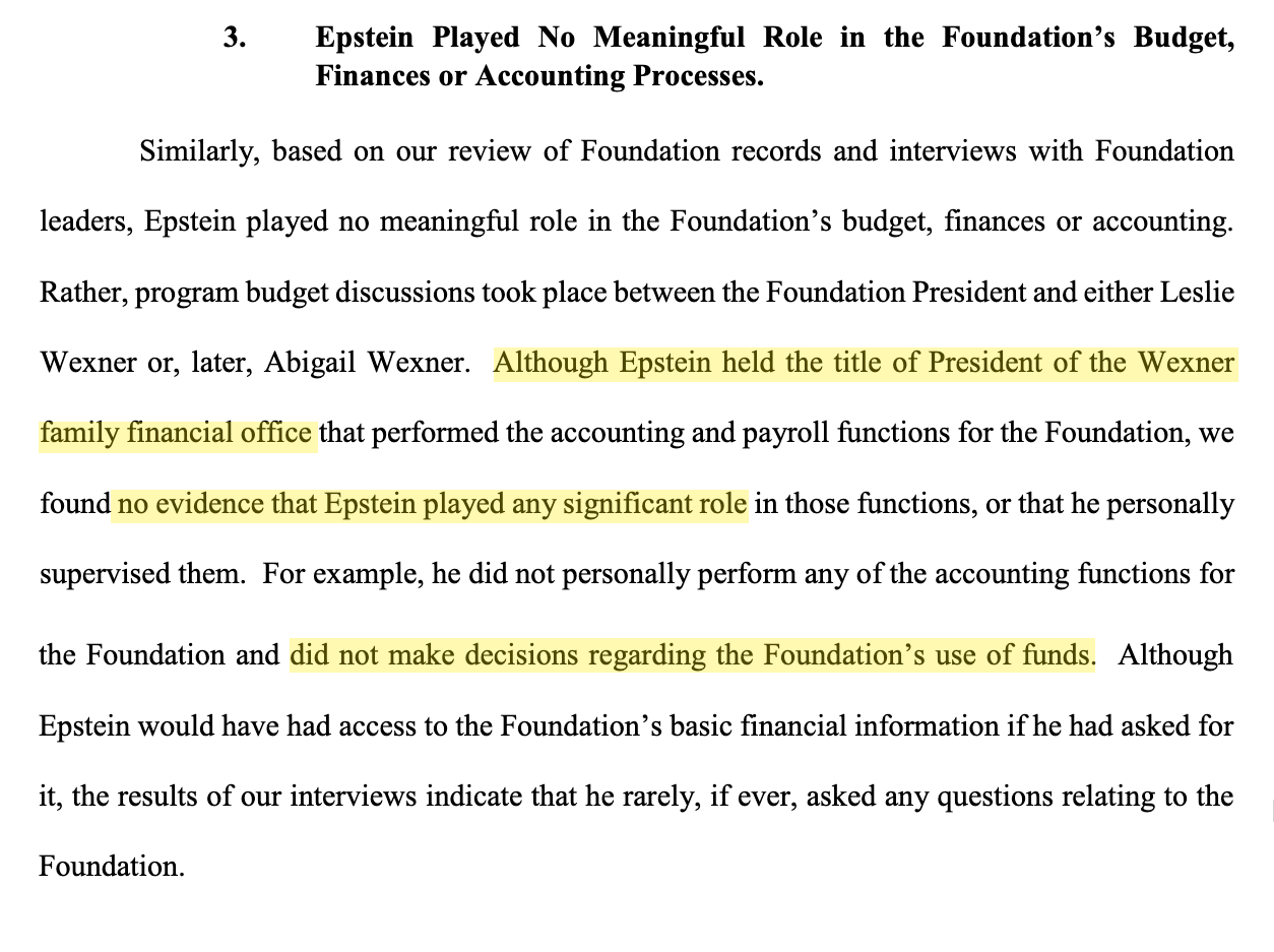 The review claimed that Wexner Foundation staff had “no contact” with Epstein after his resignation as a trustee in September 2007, and, before that, he had “played no role in the management or administration of the Foundation’s operations,” had “no meaningful role in the Foundation’s budget [or] finances,” and “did not make decisions regarding the use of Foundation’s funds.” None of that is true.