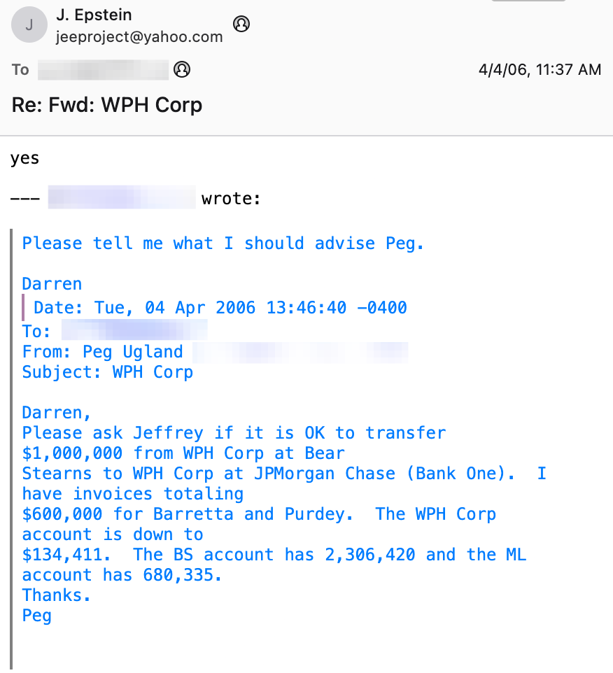 Epstein was often the final say inside the family office control room, where emails suggest there was a blurred line between personal, corporate, and philanthropic money. Epstein was frequently asked to approve funds transfers totally unrelated to philanthropy, including an April 2006 request from Ugland to move $1 million from a Wexner Personal Holdings Corp account at Bear Stearns to a JPMorgan account with the same name. Drop Site found several similar funds transfer requests between 2005 and 2008, totaling tens of millions dollars, with Ugland often explicitly requesting Indyke to “ask Jeffrey” for approval.