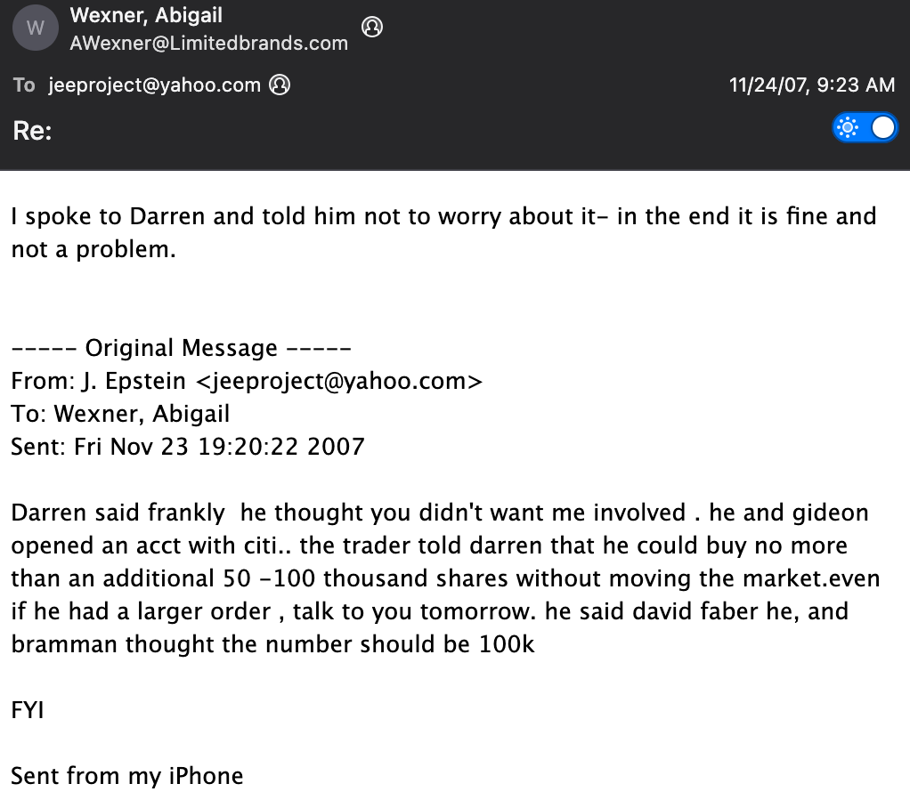 Epstein sent a detailed plan for executing the stock purchase on Black Friday, and told Abigail, “Darren said frankly he thought you didn’t want me involved.” She replied the next day, “I spoke to Darren and told him not to worry about it- in the end it is not a problem.”