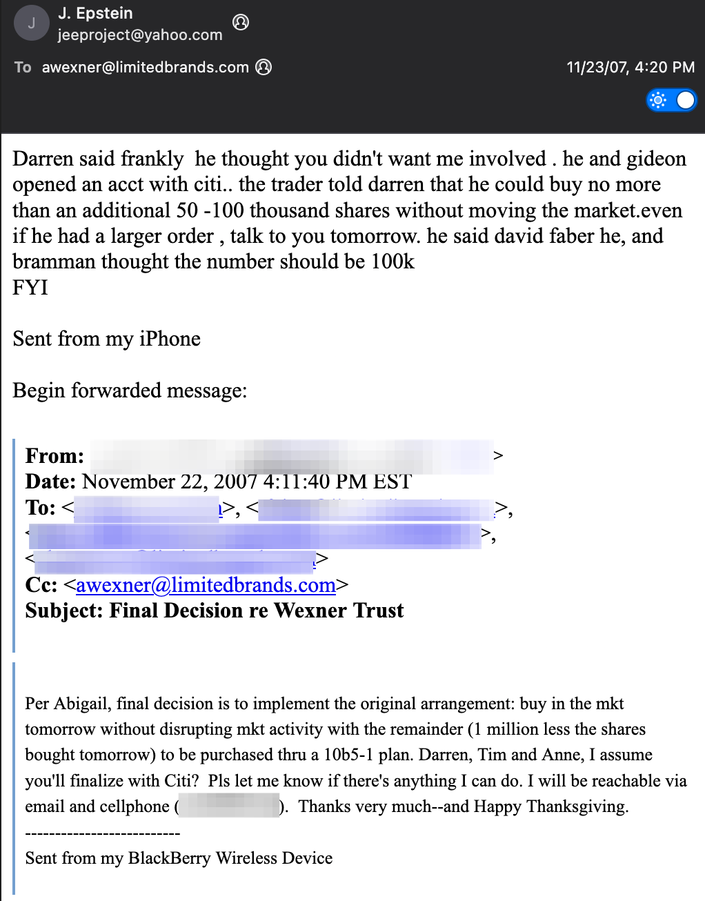 Although the Foundation’s independent reviewer claimed that its staff had “no contact” with Epstein after his resignation in September 2007, and he had “no meaningful role” before then, the emails suggest Abigail Wexner remained at least partly dependent on Epstein for months after that date. On November 23, 2007, at the beginning of the financial crisis, Epstein directly advised Abigail on executing a purchase of one million shares of Limited Brand stock, valued at almost $20 million.