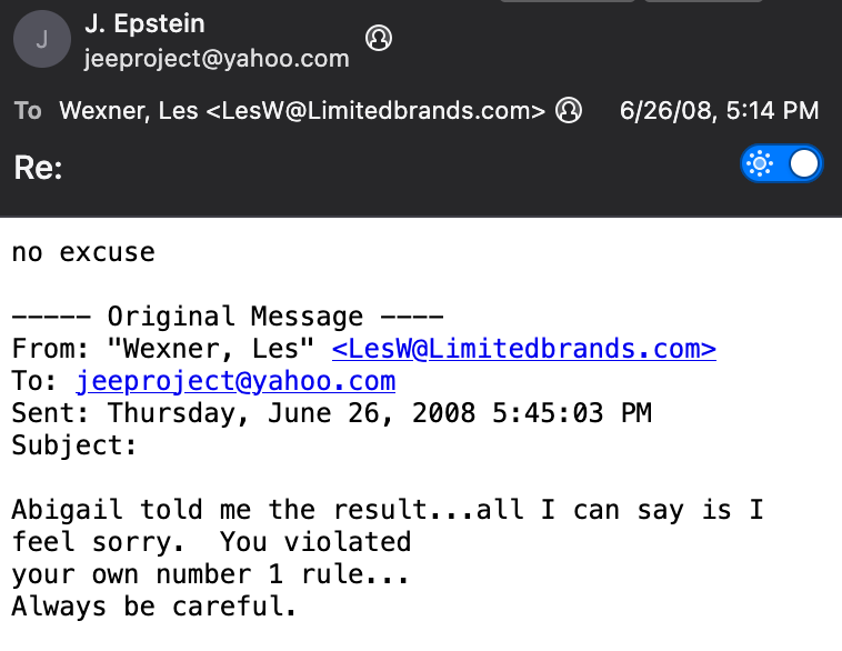 Four days before Jeffrey Epstein submitted his guilty plea to state charges of soliciting a minor for prostitution, on June 26, 2008, Leslie Wexner sent his friend an email: “Abigail told me the result…all I can say is I feel sorry. You violated your own number 1 rule… Always be careful.” Epstein’s reply to Wexner was contrite: “no excuse.”