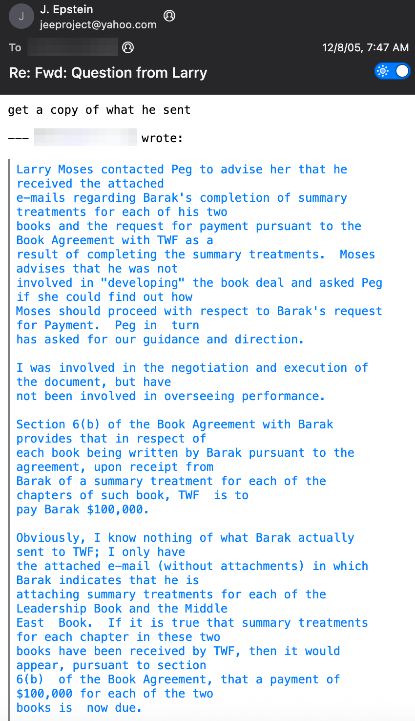 Details about that scandal are also documented in the emails obtained by Drop Site. In late 2005, Larry Moses (president of the foundation) emailed Indyke about an agreement with Barak to write two books about Middle East politics and his experience as head of state, with a fee of $100,000 per chapter to be paid to Barak by the foundation. Indyke needed Epstein to instruct on how to execute the payments, writing, “Please advise what you want Peg to tell Larry Moses.”