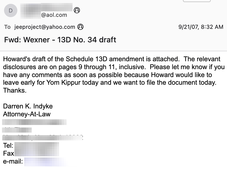 The next year, on September 21, 2007, two weeks after Epstein had supposedly resigned as trustee, Indyke sent another 13D draft for Epstein’s comment and approval. In the 2007 filing, Epstein and FTC were no longer named, replaced by Indyke himself as trustee.