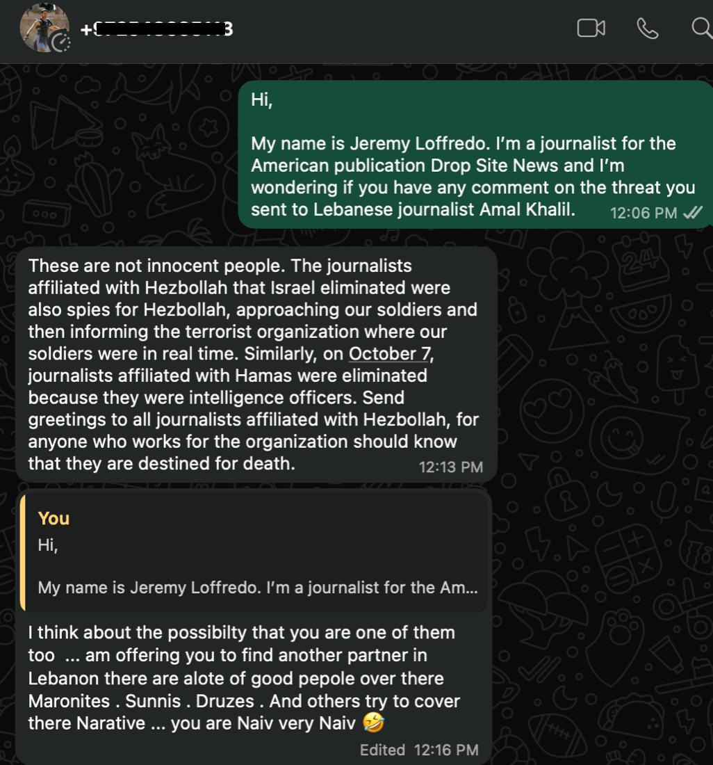 When contacted by Drop Site on Wednesday before news of Khalil’s death emerged, Ben Avraham confirmed he sent the threats in 2024. “Send greetings to all journalists affiliated with Hezbollah, for anyone who works for the organization should know that they are destined for death,” he wrote, later clarifying that he considered Al-Akhbar “Hezbollah-affiliated” and that “only Hezbollah related should be afraid,” while Maronites and Sunnis should face no such threats.