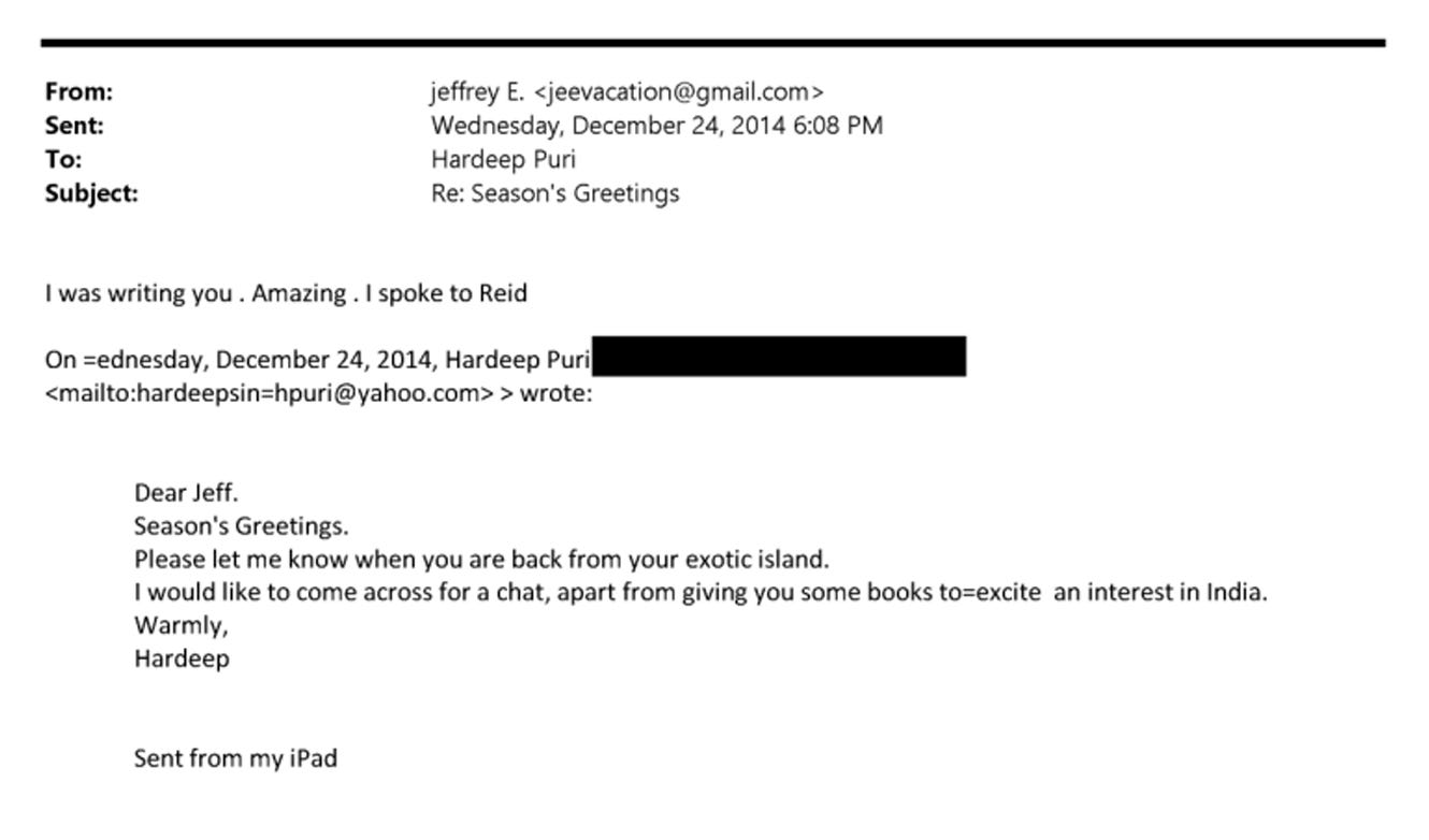 In December 2014, Puri had written to Epstein again: “Please let me know when you are back from your exotic island,” adding that he wanted to stop by with books to “excite an interest in India.”