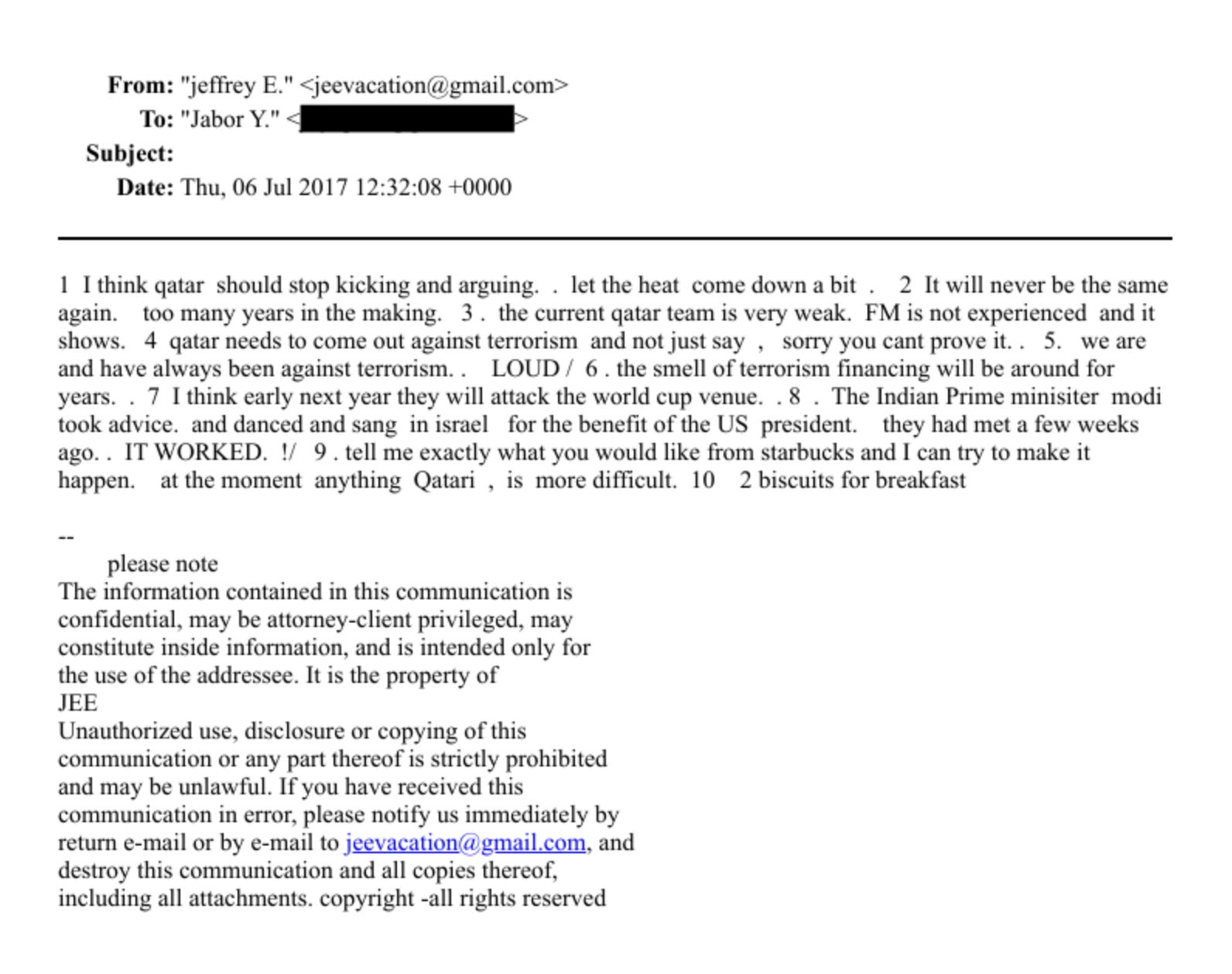 On July 6, 2017, as Modi concluded his historic visit to Israel, an elated Epstein wrote to an individual identified in the emails as Jabor Y, identified in past reporting as an individual with ties to Qatar’s former prime minister, Hamad bin Jassim bin Jaber Al Thani. “The Indian Prime minisiter modi took advice. and danced and sang in israel for the benefit of the US president,” Epstein wrote. “they had met a few weeks ago.. IT WORKED. !”
