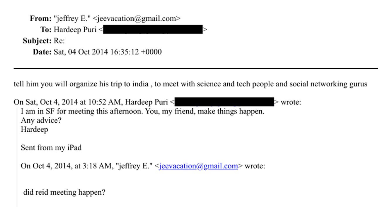 In November, Puri followed up with a detailed pitch to Epstein and Hoffman outlining India’s economic plans under Modi. “The market buzz is strengthened by the election of a new Government with a strong mandate bent on reviving the Indian economy with a major focus on Digital India,” he wrote, urging Hoffman to visit India. “I am now convinced more than ever that India today presents a terrific opportunity for internet-based economic activity,” he added.