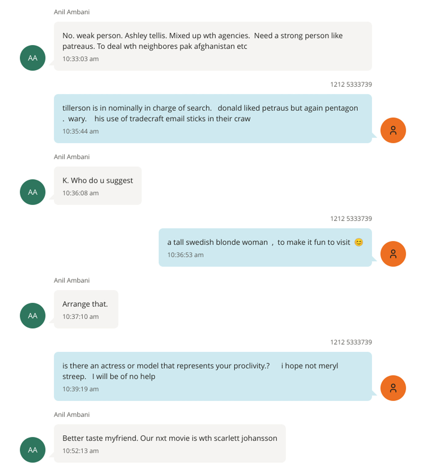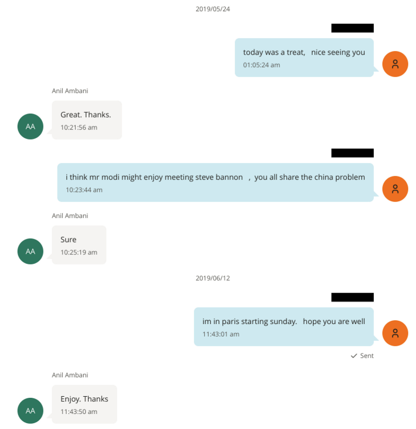 Ambani texted Epstein, “Hello. Was in delhi. Leadership wld like ur help for me to meet jared and bannon asap. PI advise. Likely visit to dc by pm in may to meet donald. Also assitance on that.” Epstein and Ambani proceeded to set up a time to chat. A few messages later, Ambani texted, “Thanks as always.” Epstein responded, “Fun.”