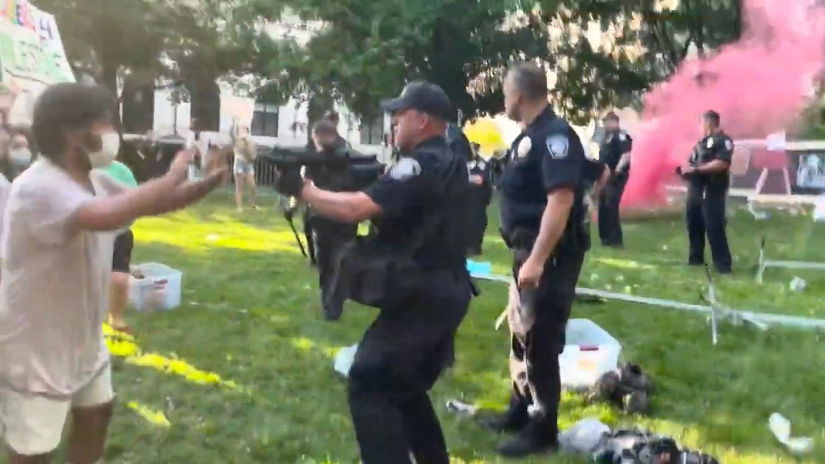 Lt. Brooke Riley’s body camera was recording as she repeatedly screamed at other protesters and Ali, demanding to know whether they wanted to hurt her. Ali, wearing a tee shirt with beige shorts and a white face mask, walked over. He checked on another protestor and stepped between them and Riley, standing near fallen barriers. He stared ahead and said “yes.” After Ali tried to pick up one of the barriers, Riley, Ali, and Florkewicz pulled back and forth on the metal fence for a few seconds before Ali let go and stepped back.