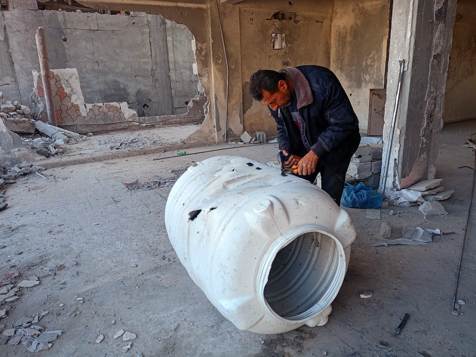 Shaheen, 48, an electrician by trade, never imagined he would become a barrel repairman, ensuring water storage for households in Gaza.