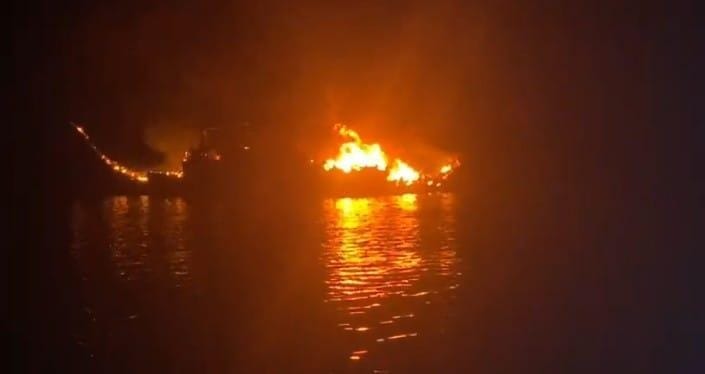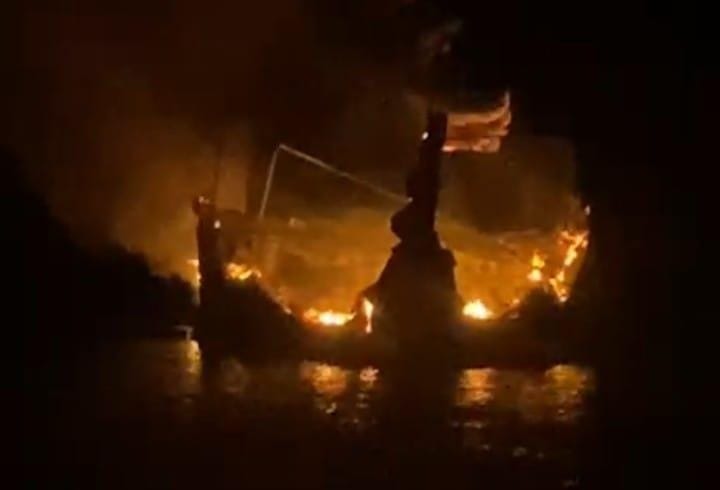 La Negra Francisca Duarte II burning on March 17, 2026, captured by nephew of Captain Hernan Flores and provided to Drop Site News.